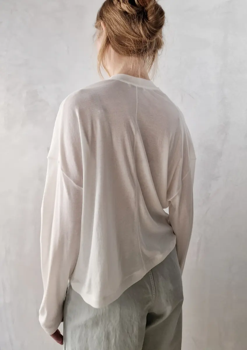 This long-sleeve T-shirt features a perfectly relaxed fit. While retaining the signature oversized silhouette of ATON’s classic T-shirts, the length has been cut so it can be worn tucked out over bottoms. It creates the look of wearing a men’s size T-shirt.