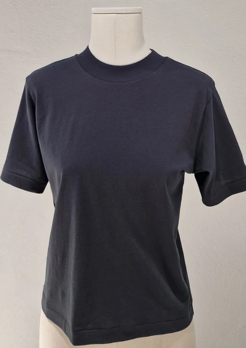 This mock neck T-shirt features a comfortably relaxed fit. The body balance is tailored for a feminine silhouette, with longer ribbed cuffs as a key detail. The neckline and body width are designed to also work as a knit inner layer. The collar is neither too high nor too tight, allowing for relaxed wear.