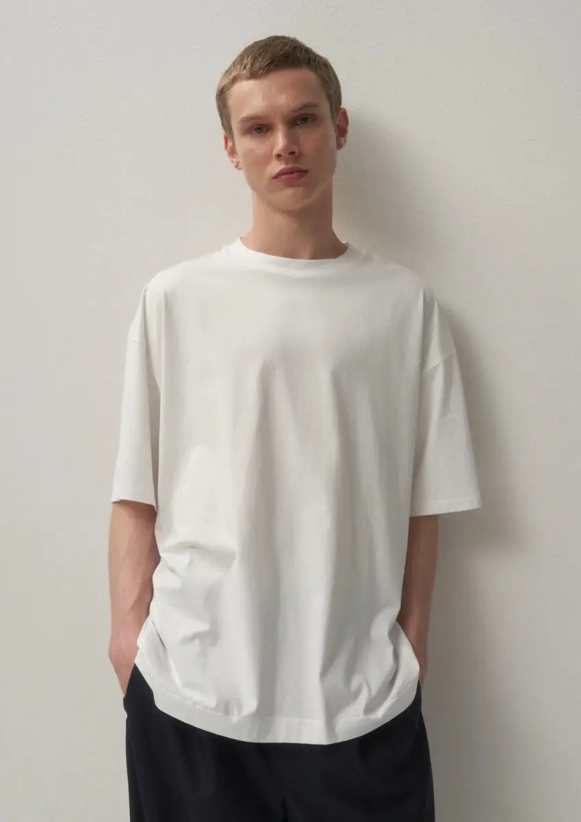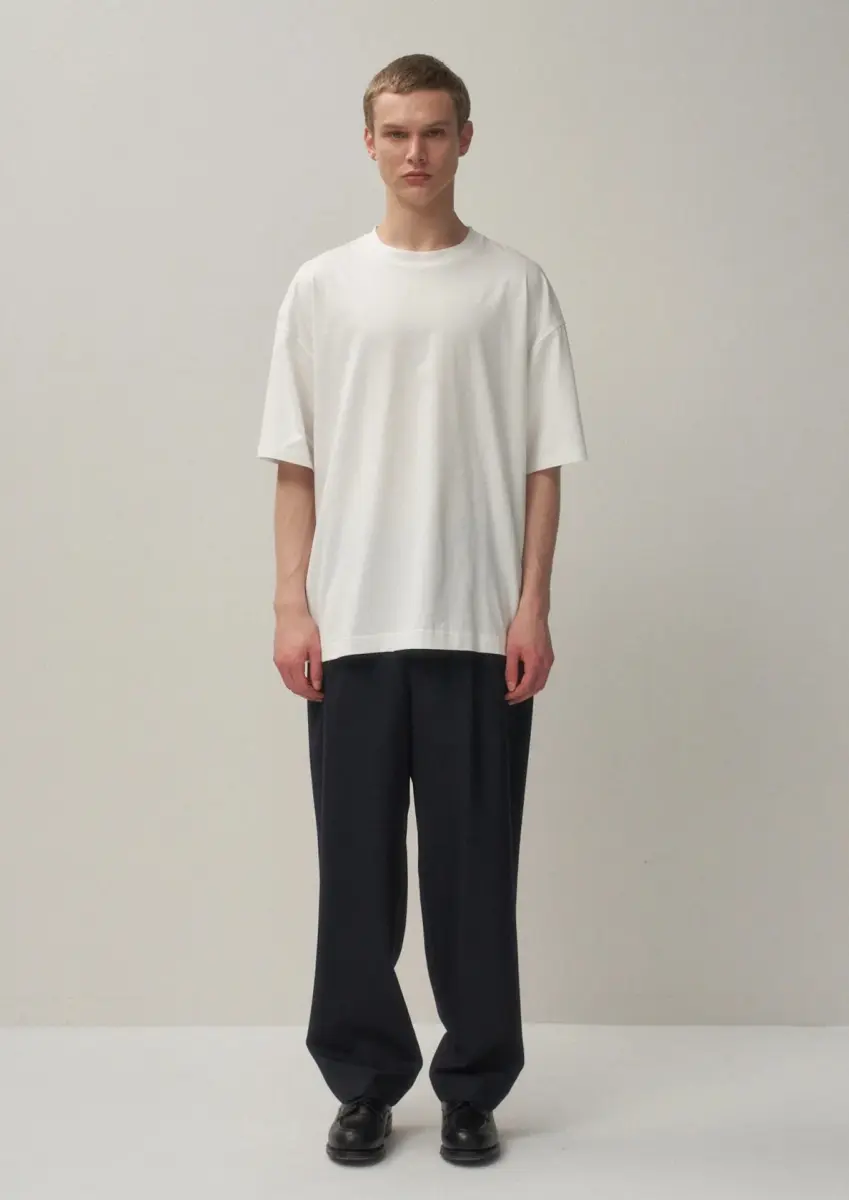 ATON’s standard T-shirt with a strong presence and oversized design. The silhouette is roomy, and the ratio of length to width is a little long, giving it a slightly modish impression. The material has a sense of fall, making it a dress that looks good even when worn oversized by women.