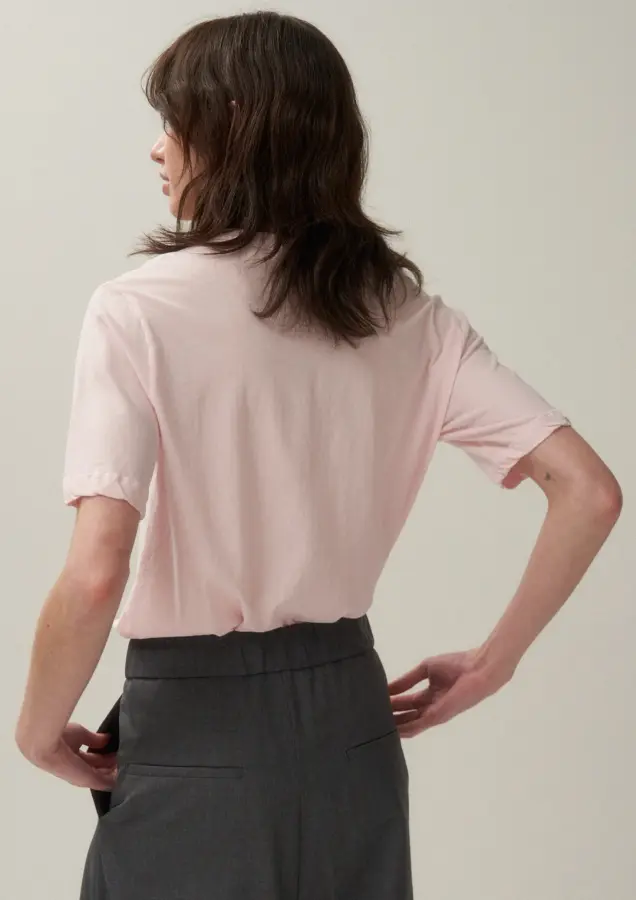 A standard T-shirt in a regular size. The not-too-big shoulder width and slightly higher sleeve heights make it a versatile item that can be used as an inner layer or on its own.