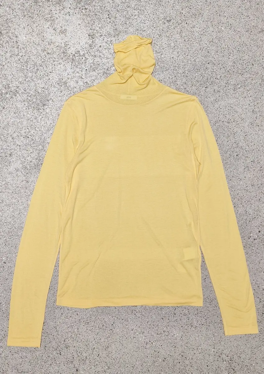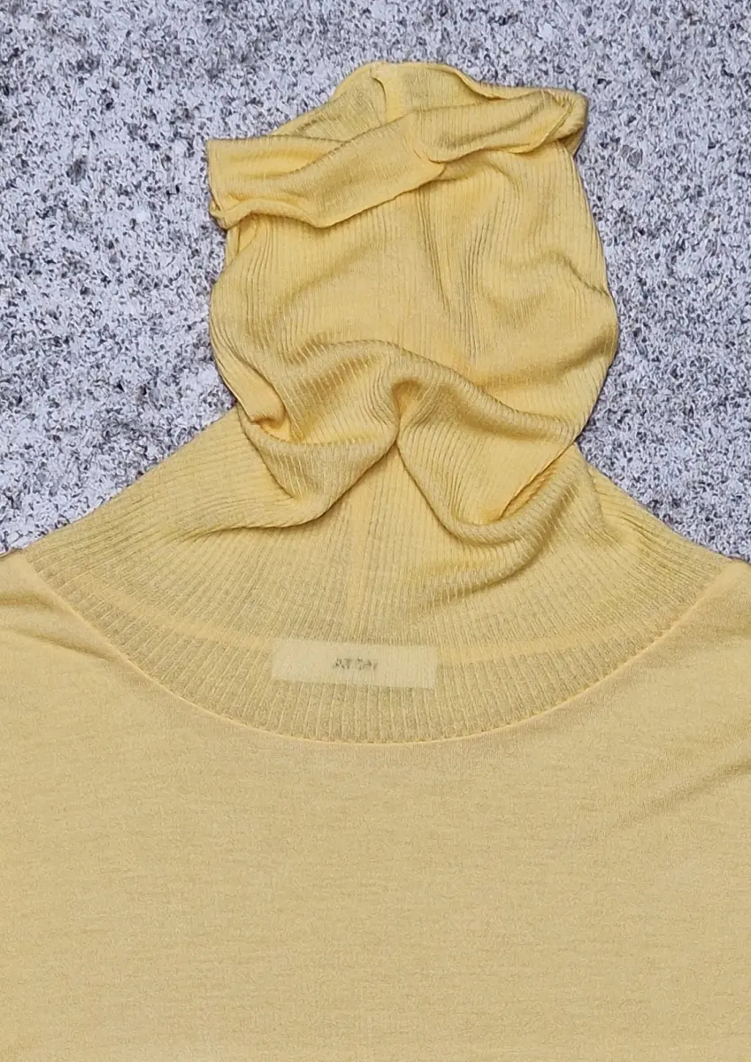 Turtleneck cut and sewn with a sharp silhouette for layering. The knitting fabric is switched to ribbing only at the collar to create a clean silhouette along the neck. The collar edge is not folded back, but is lightly finished like a knit using a couture technique. The sleeves are set to a longer length so that this cut and sewn garment can be enjoyed not only at the collar but also at the cuffs for layering.