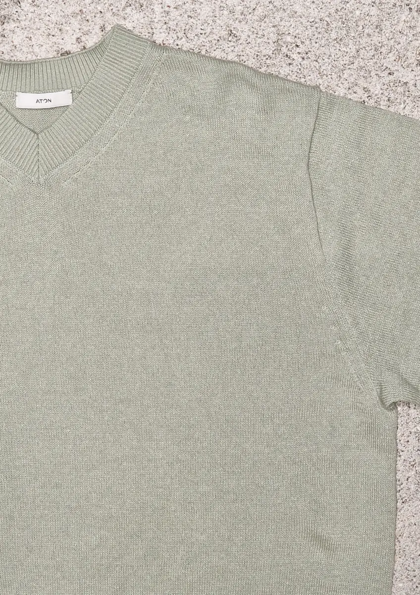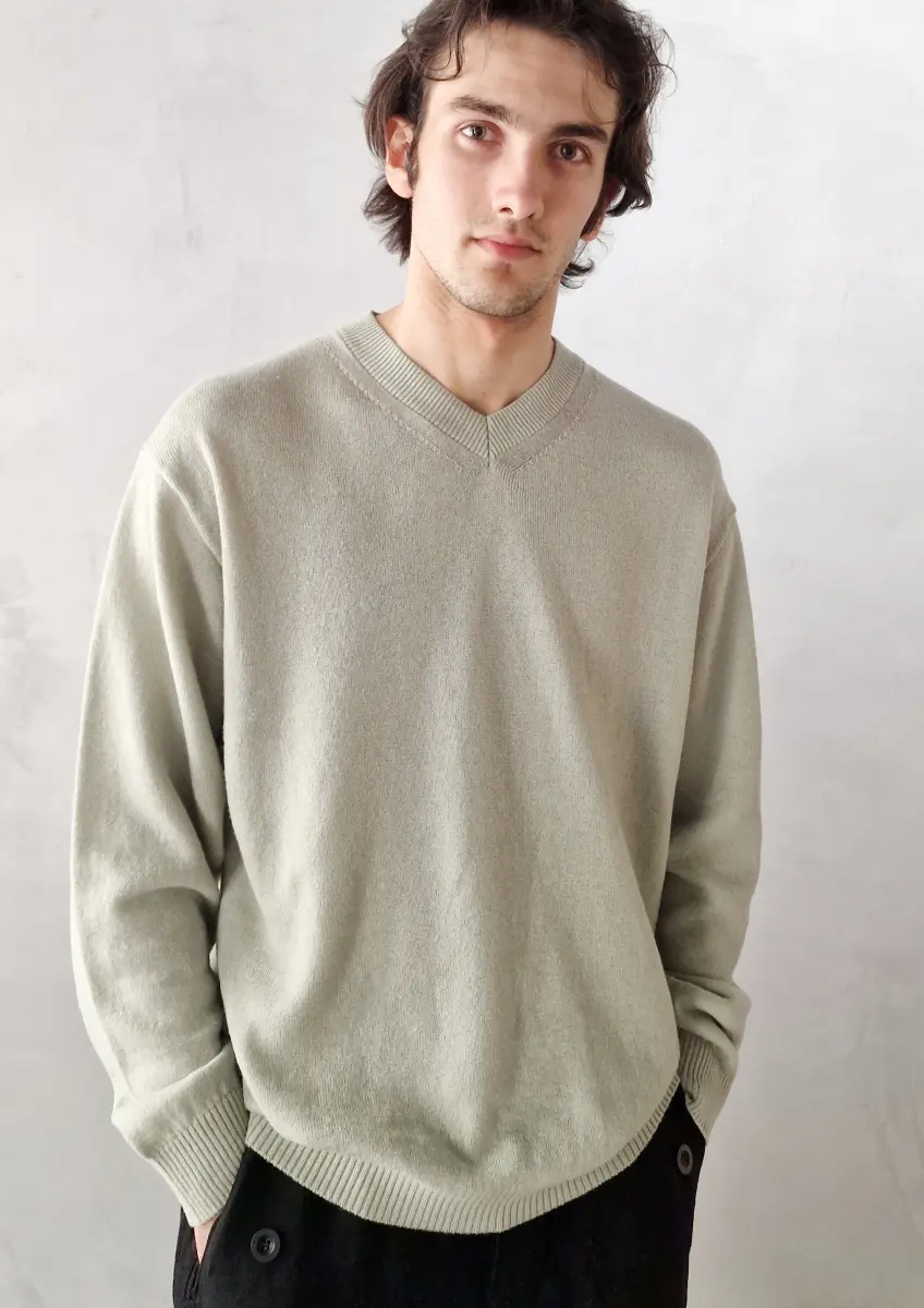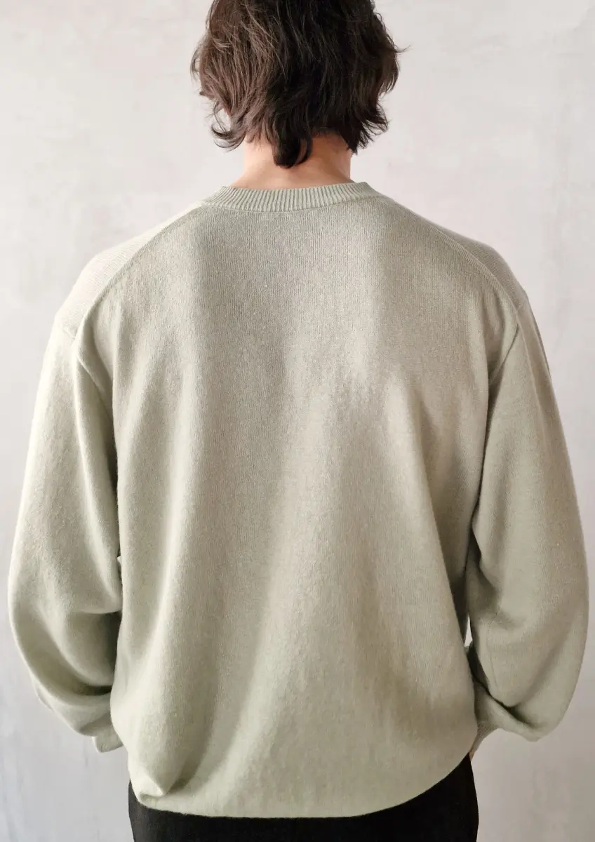 This V-neck sweater features a moderately relaxed feel. Jersey 10 gauge is used, with a slight degree of stuffing for firmness and comfort. The collar is double-ribbed with thicker ribbing, and the hem ribbing is not too tight, adopting a cut-and-sew silhouette.