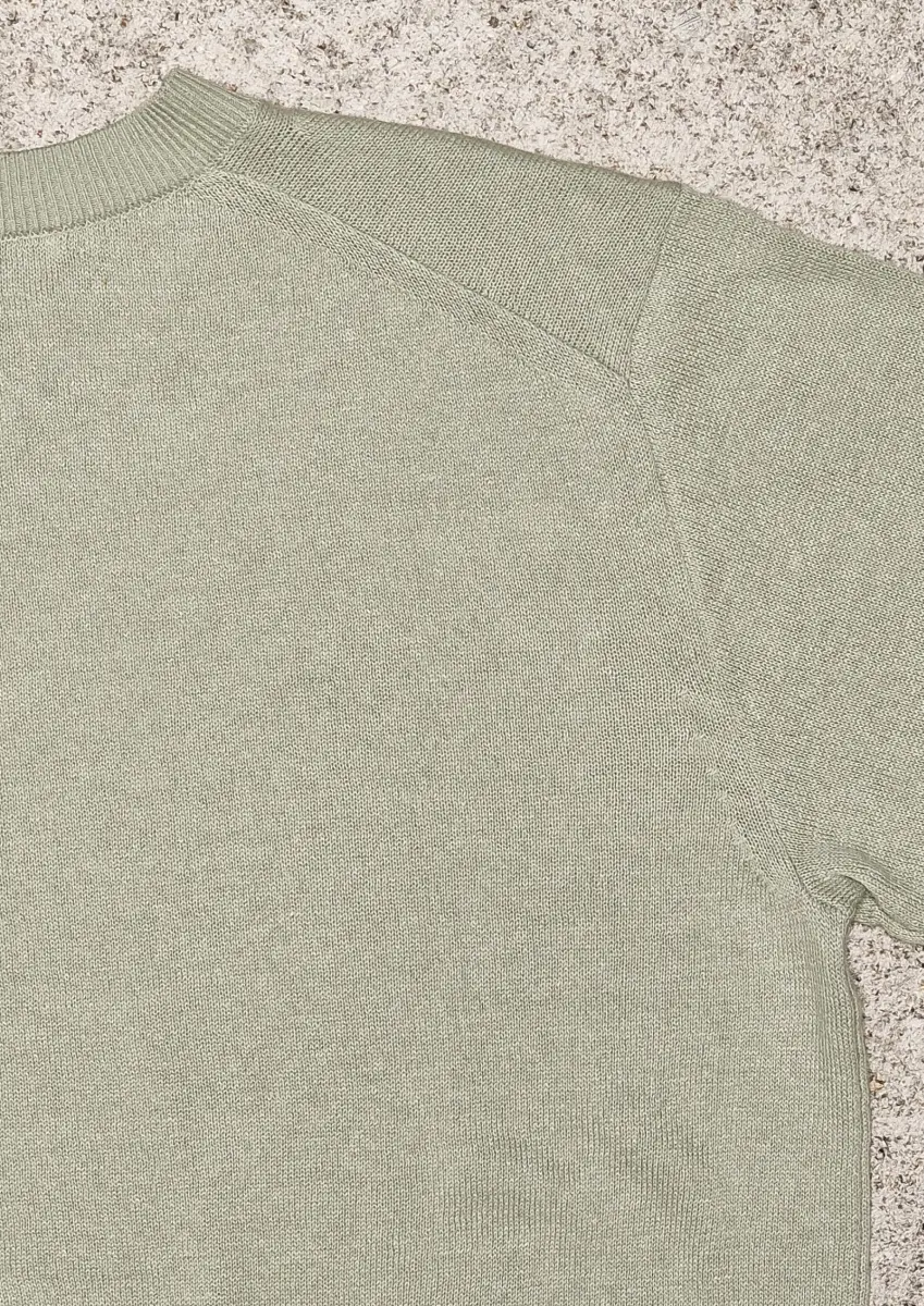 This knit material is made of extra fine merino wool and twisted ultra-fine linen yarn. The yarn is raised at the yarn stage and then tightly shrunk in the finished product, resulting in a unique texture that combines the extremely light and smooth touch of extra-fine merino wool with the coolness and luster of linen.