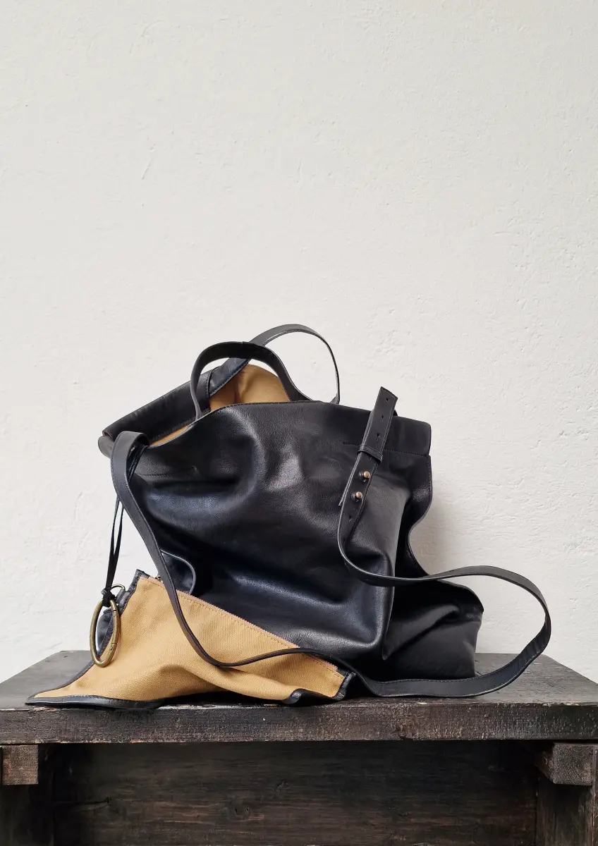 Tumbled leather, canvas lining, adjustable handles, crossbody strap removable, additional bag with zip and added keychain removable, three pockets inside, one with a zip.