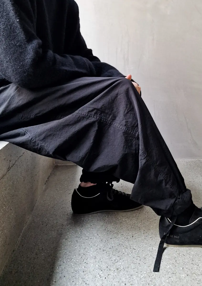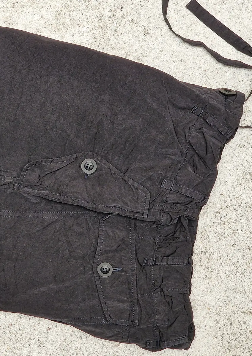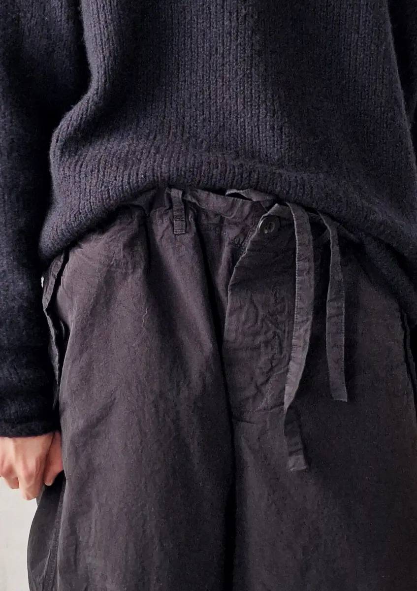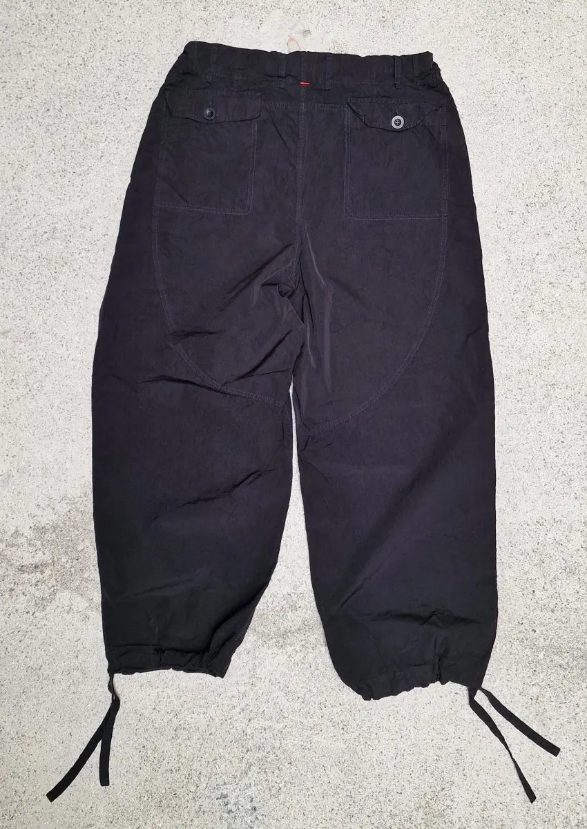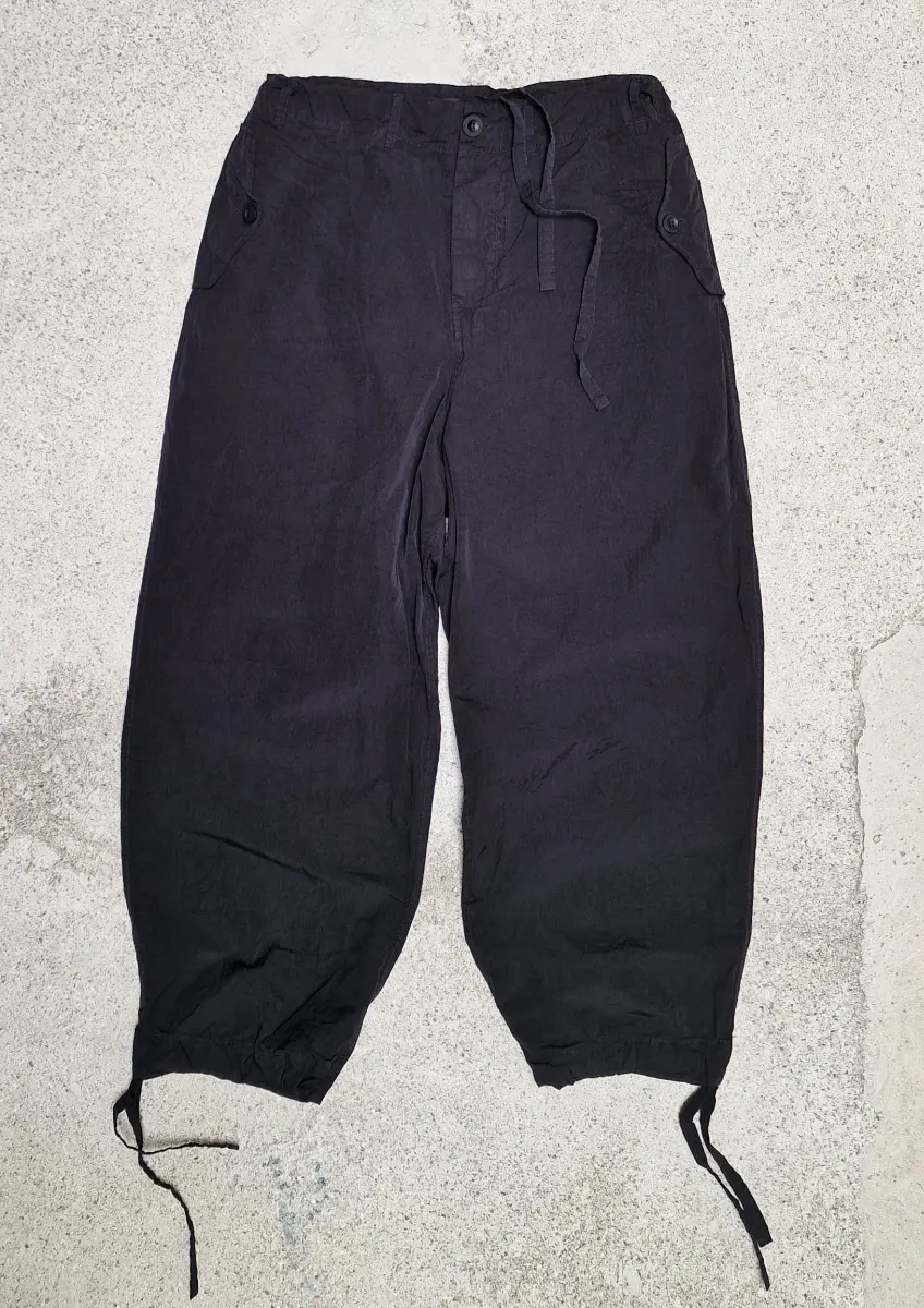 Wide drawstring pants in Casey Casey’s signature washed, crisp paper cotton. Belt loops, concealed button fly, side flap pockets, two patch pockets with flap closure, adjustable drawstring at waist and hem. Fits large.