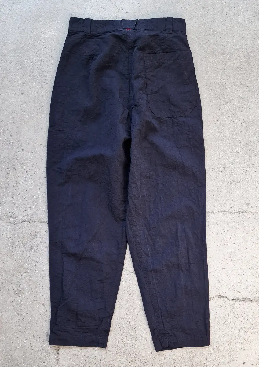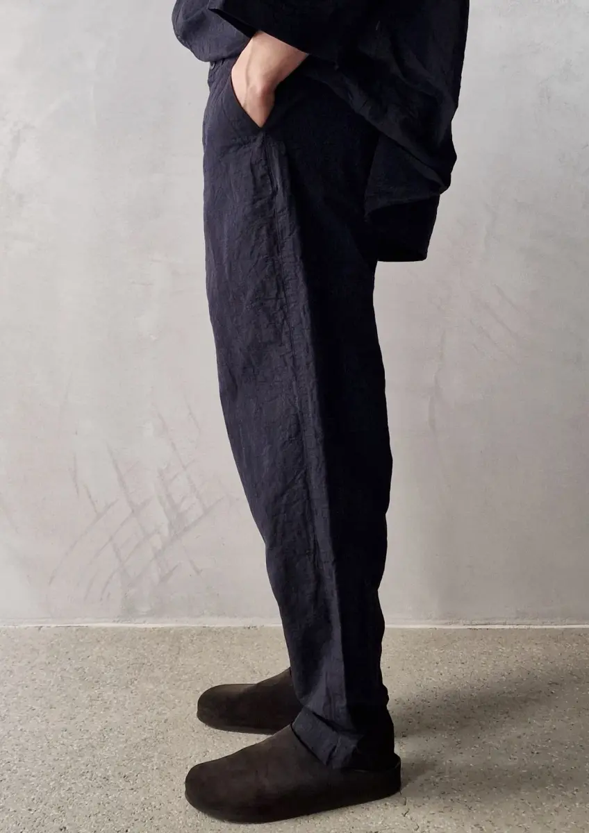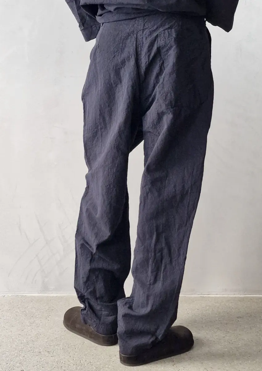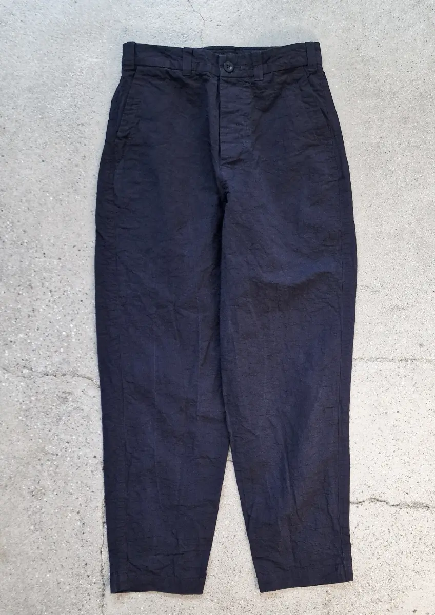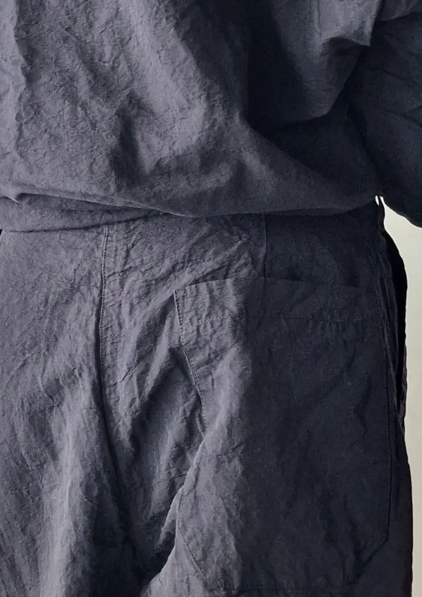 Cargo inspired pants, secure waist closure, flat front, slanted side pockets, single patch pocket at the back. Heavy weight cotton/linen fabric, rigid quality.