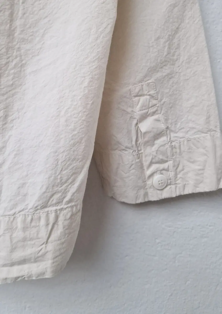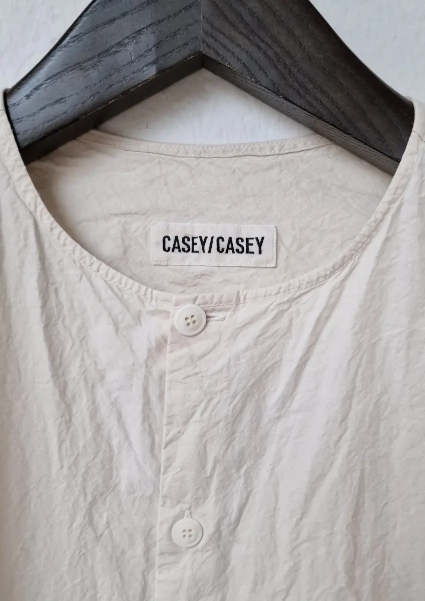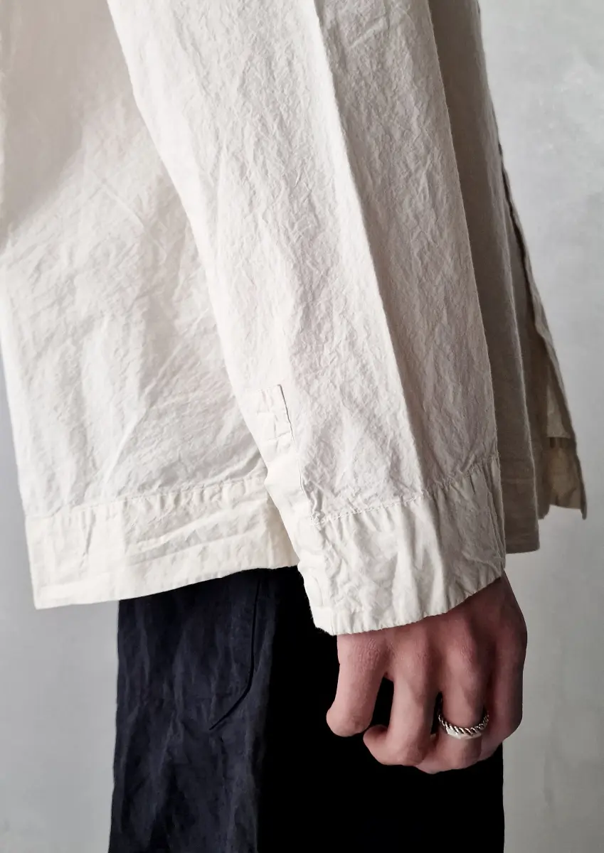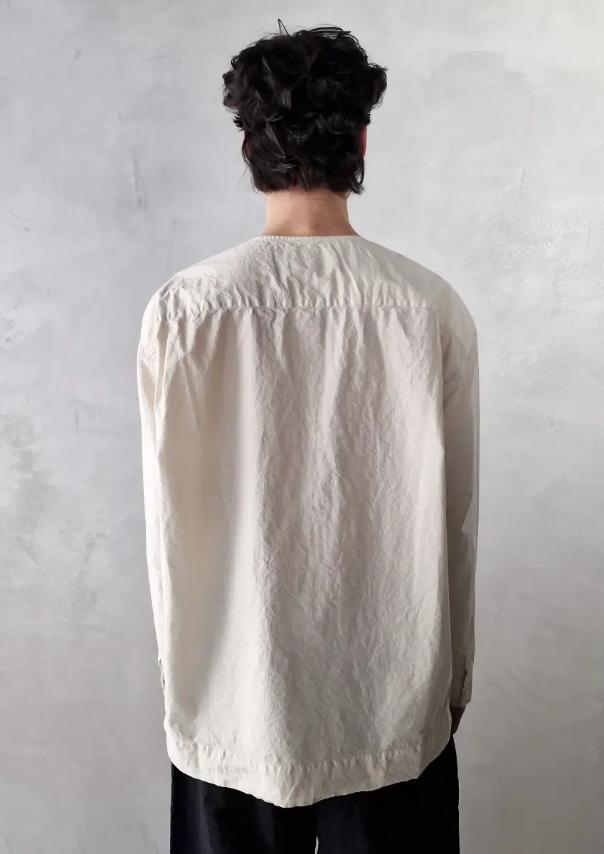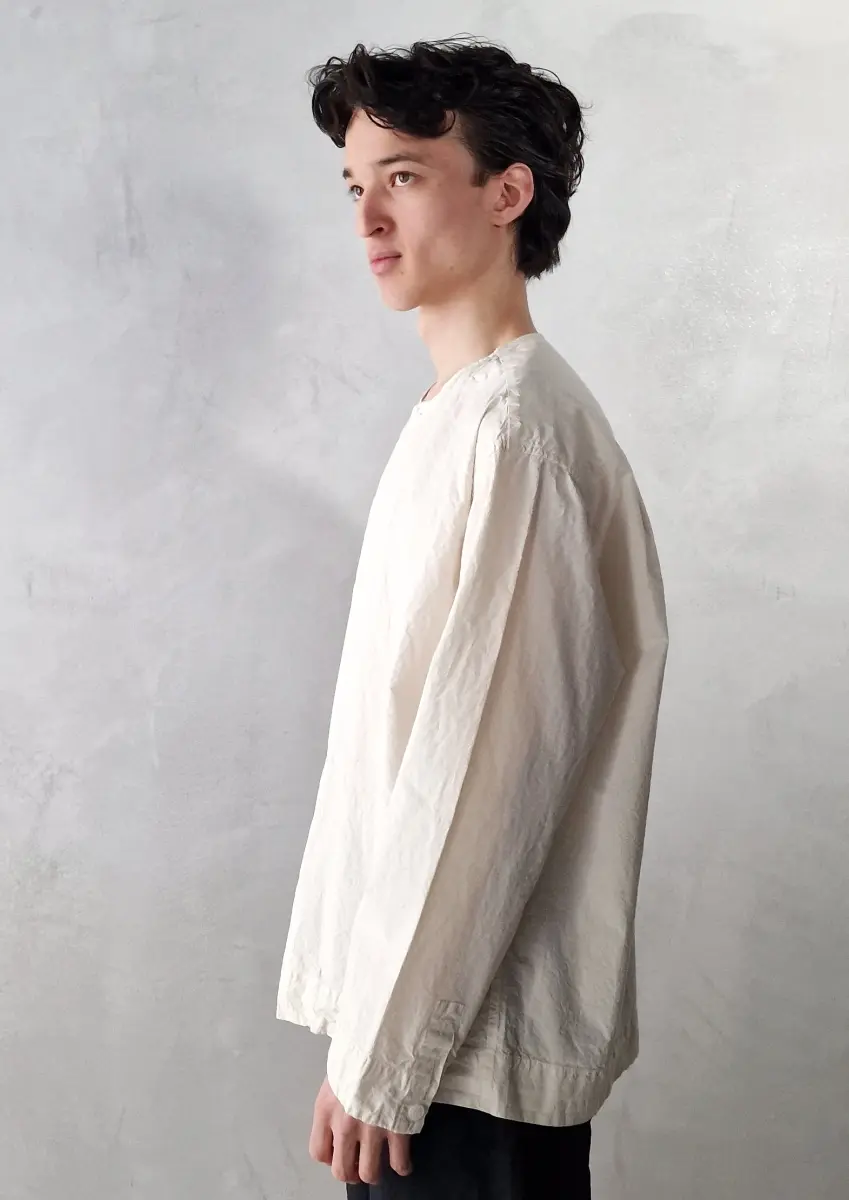 Collarless long-sleeved shirt, straight hem, clean cuffs. Undyed regular weight cotton.