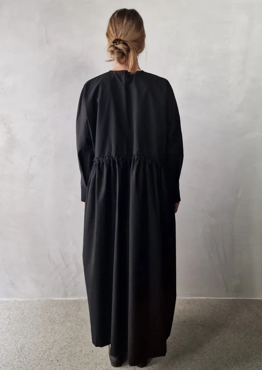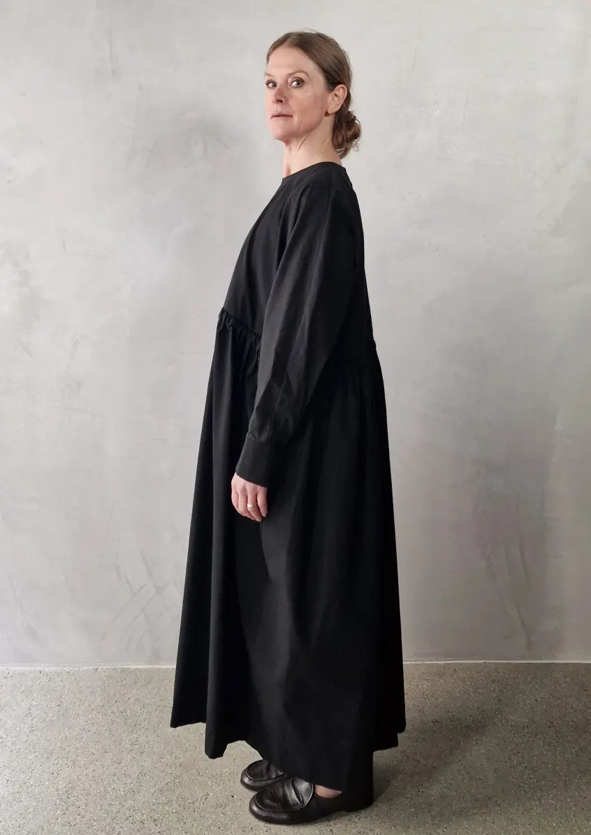 Collarless dress, long-sleeved, drawstring at the waist-line, buttoned at the neck, two side pockets, fits generous.