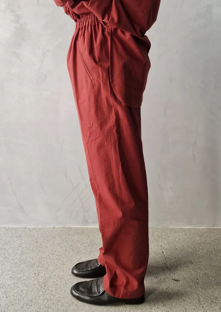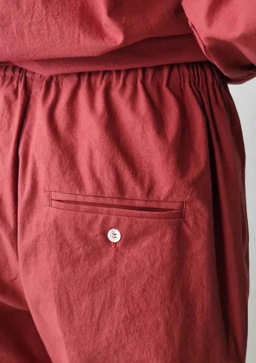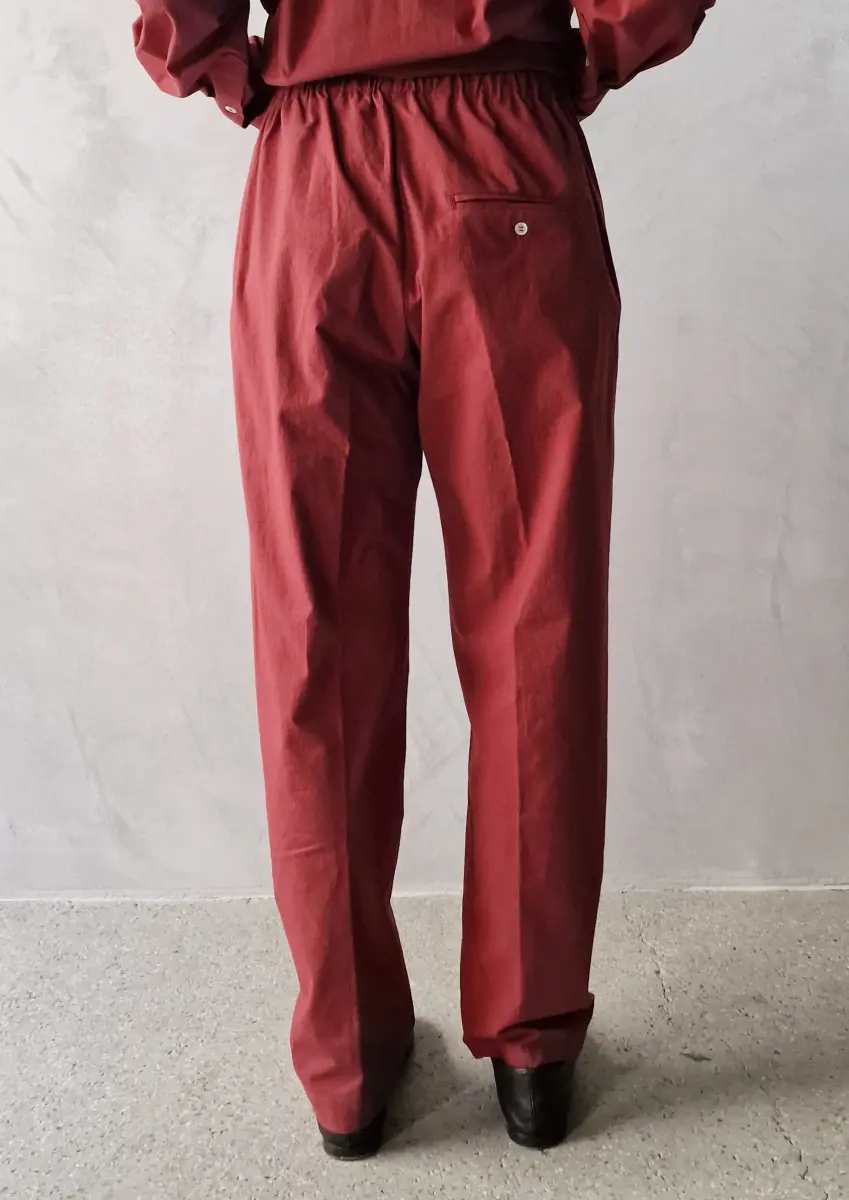 Easy pull-up-pants, elastic waistband, tapered, two relaxed side pockets, one pocket on the back.