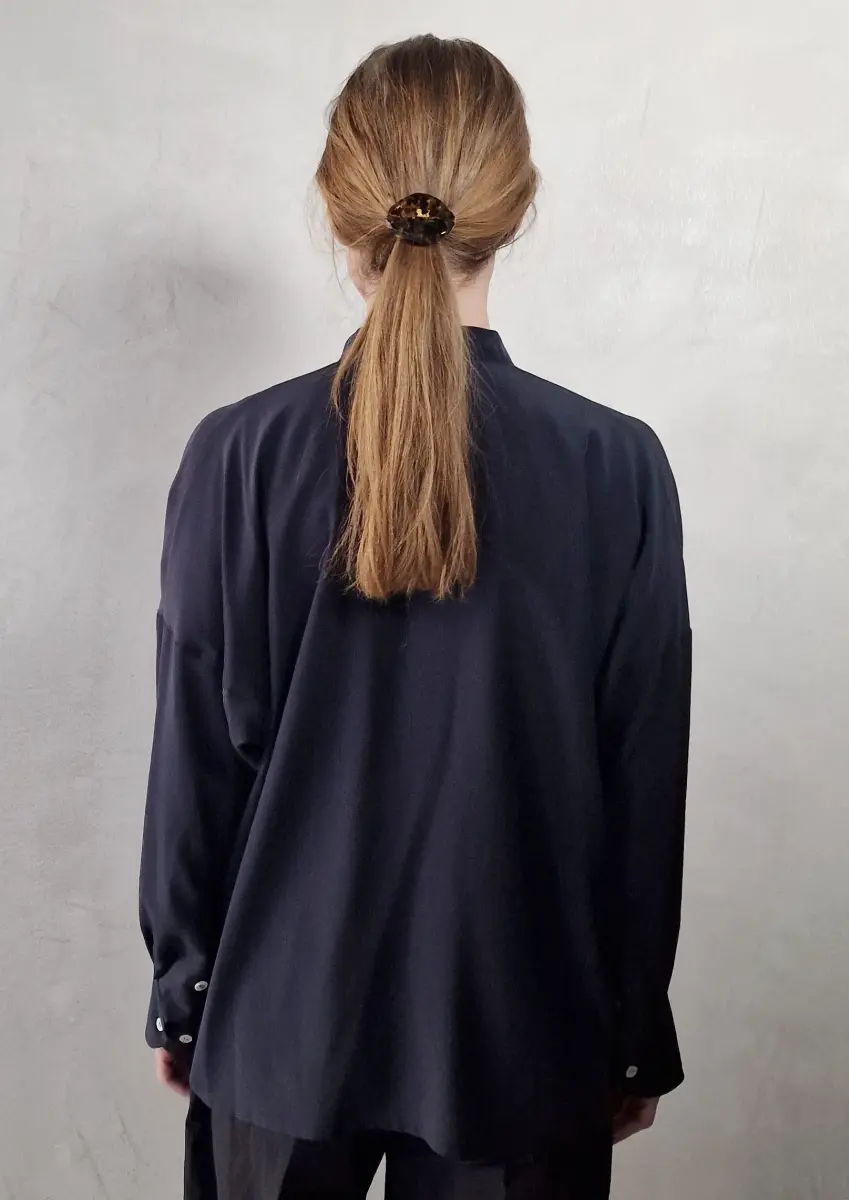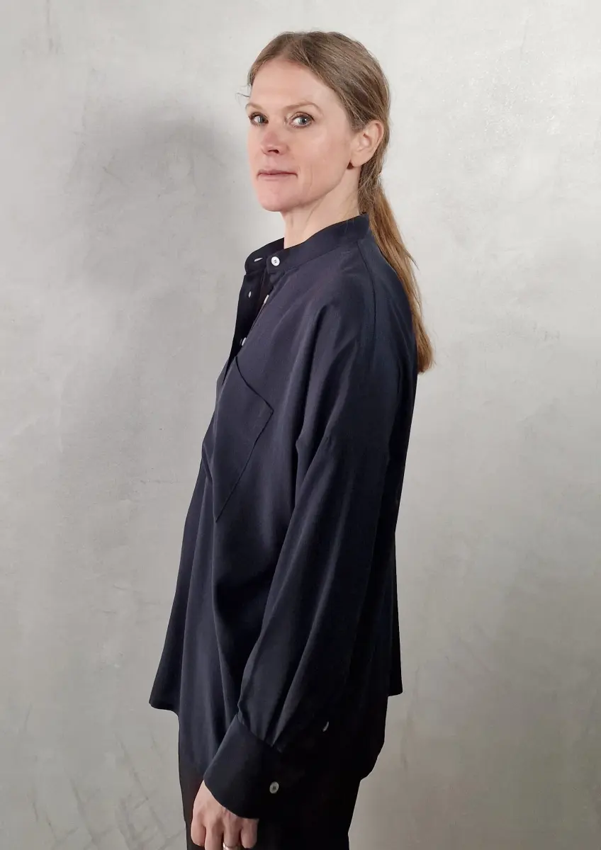 Mercato shirt is a classic style, it comes in different qualities and colours, here soft silk crepe, band collar, long-sleeved, half buttoned, one patch pocket, fits generous.