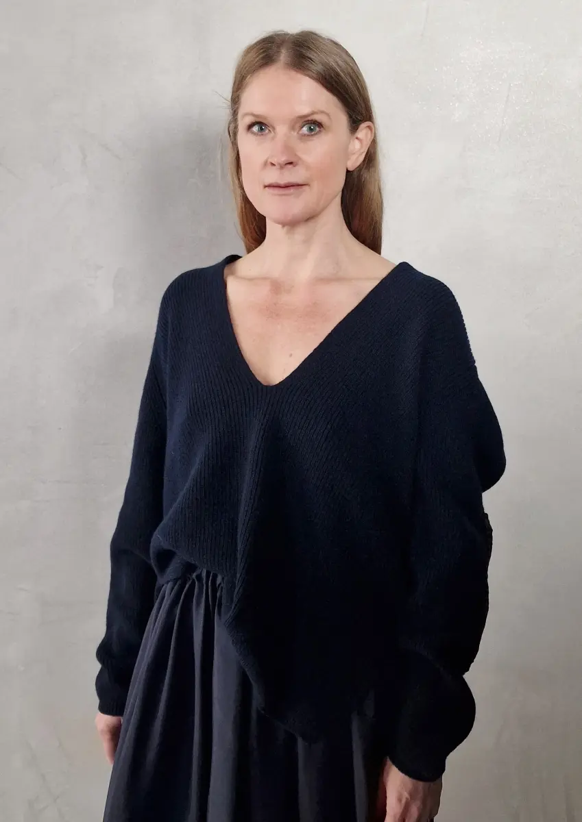 Deep V neck oversize sweater, lightweight finest merinos wool, large side slit.