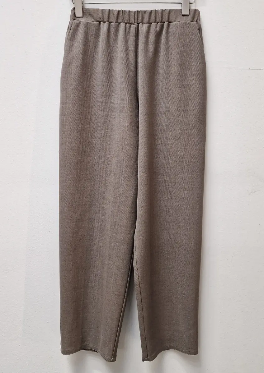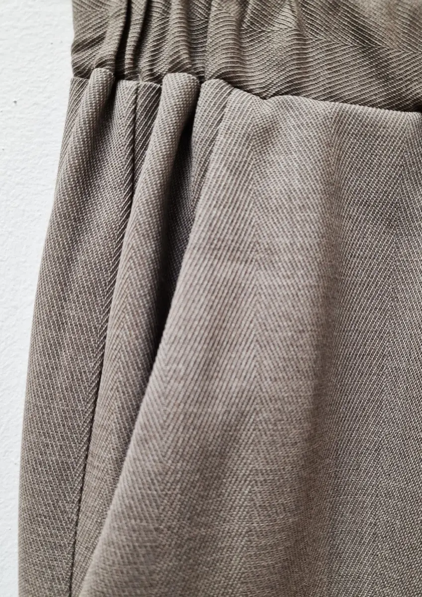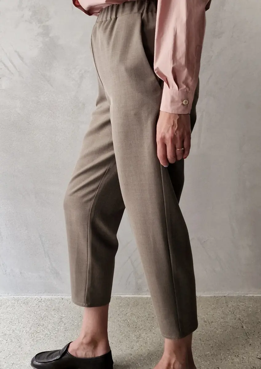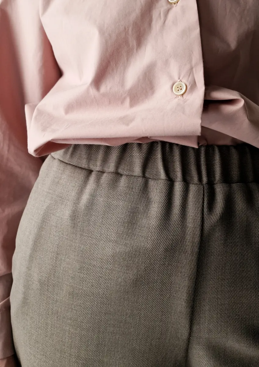 Signature pull-up-pants, elastic waistband, tapered and cropped, two relaxed side pockets. Lightweight wool. Herringbone.
