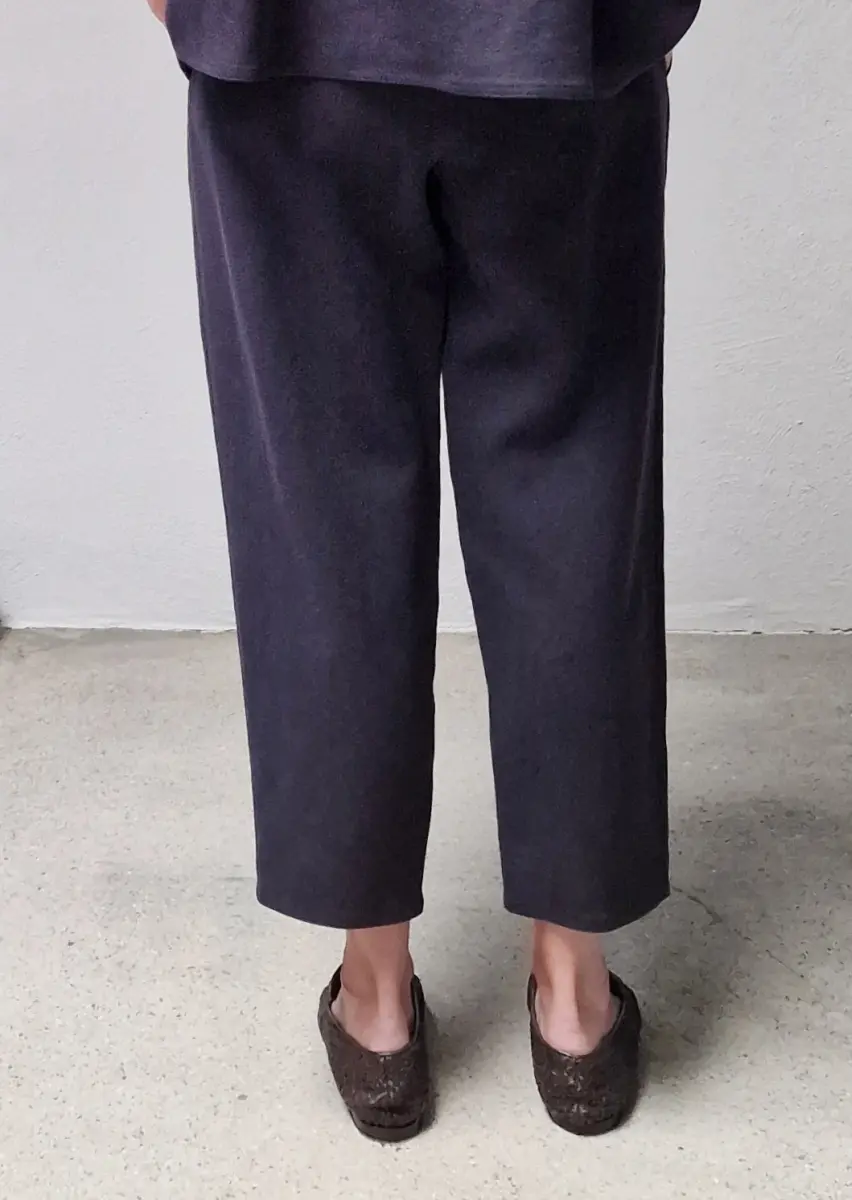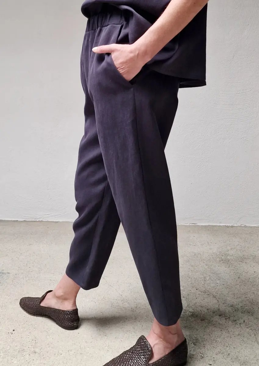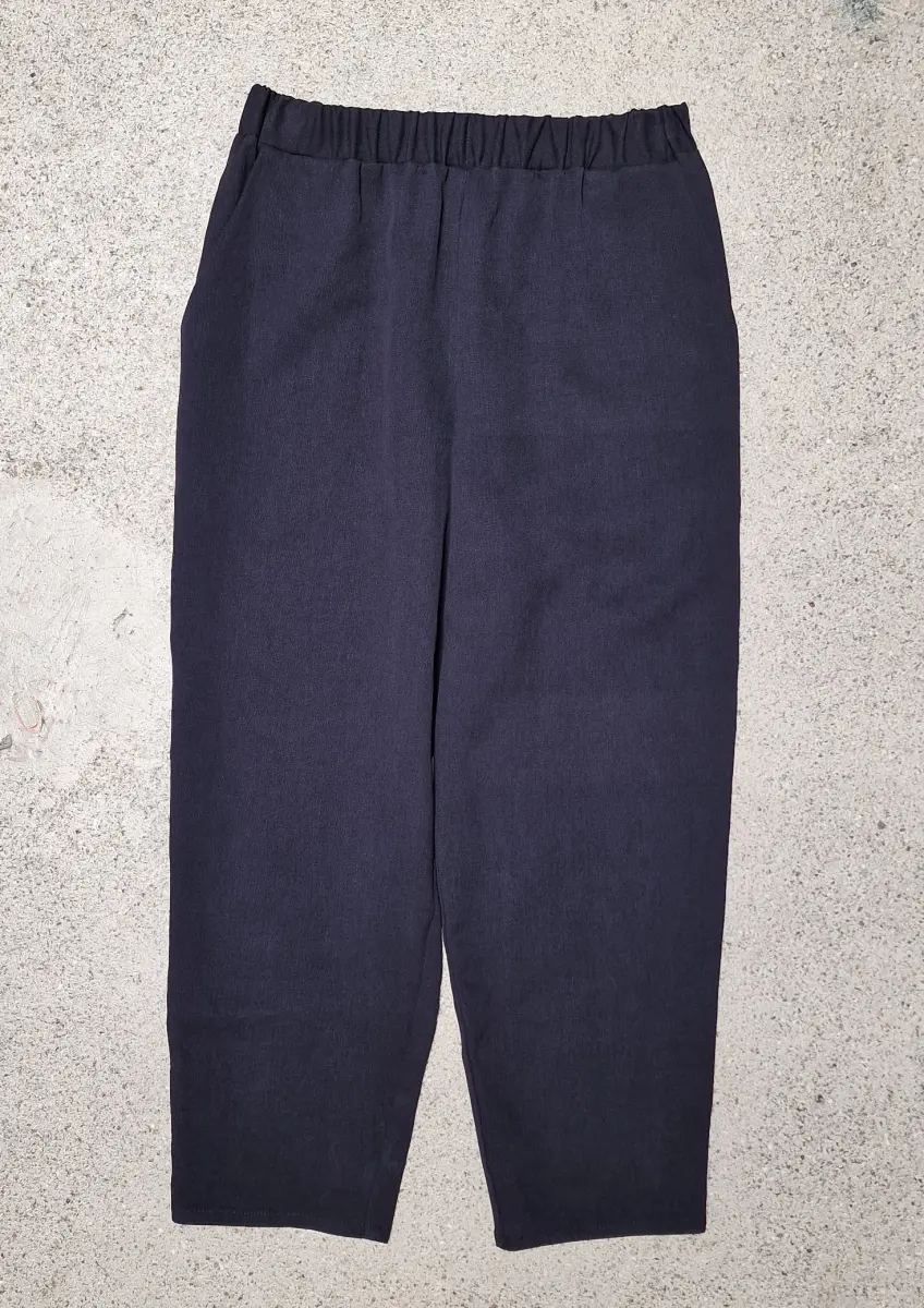 Signature pull-up-pants, elastic waistband, tapered and cropped, two relaxed sidepockets. Heavy linen fabric.