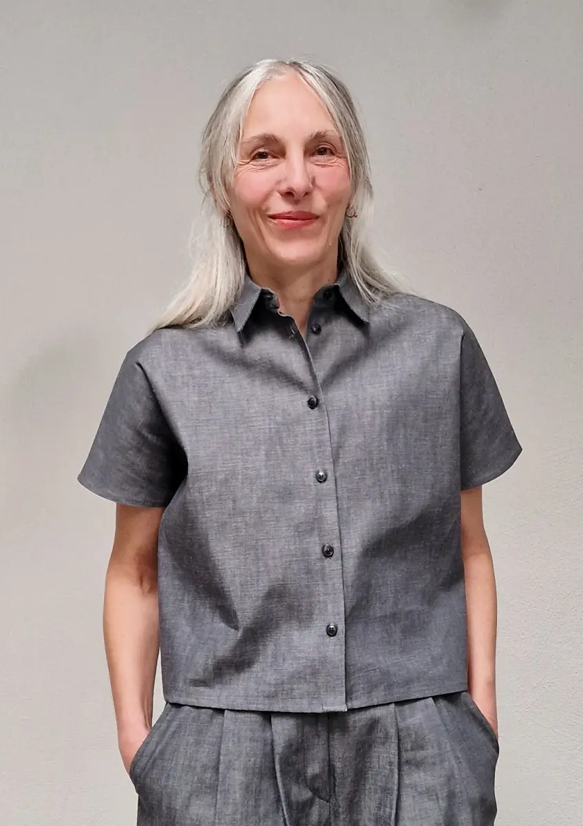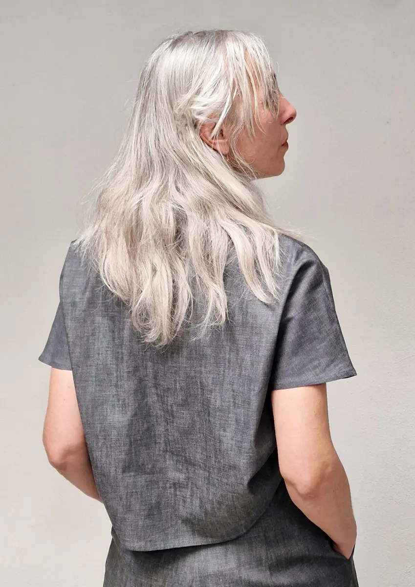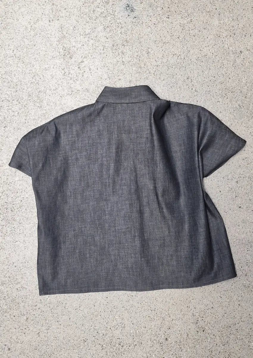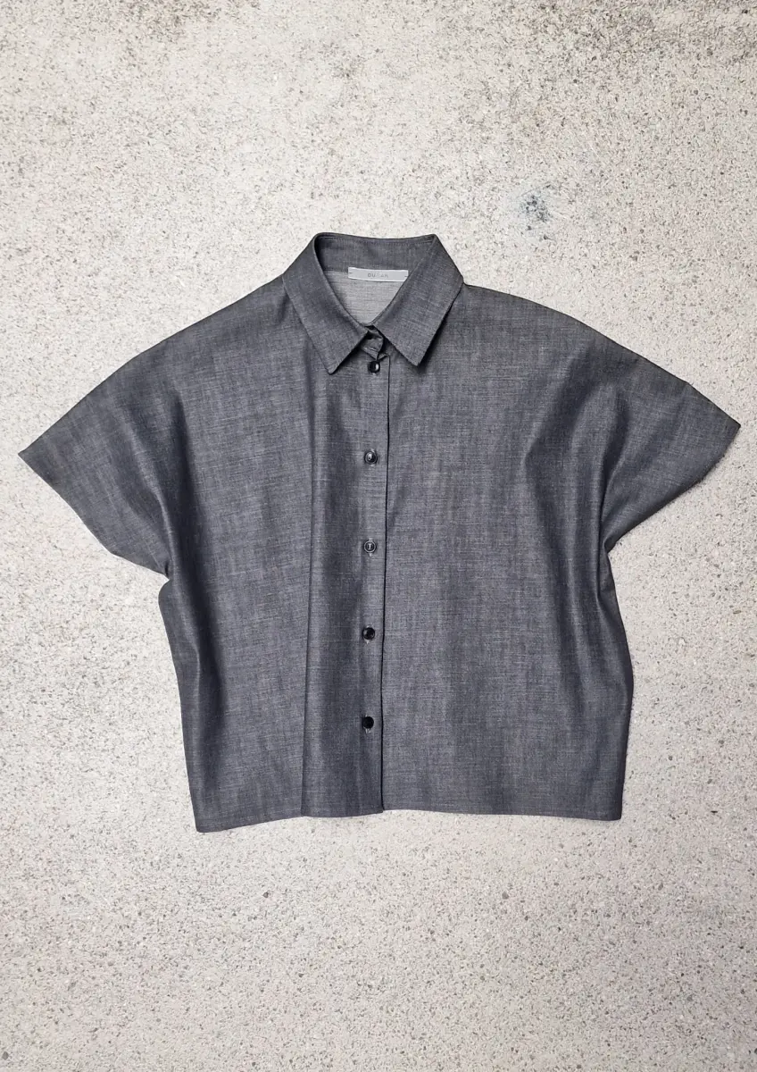 Short sleeve shirt, with a classic chemise collar, fits loose and has a short body, no pockets.
