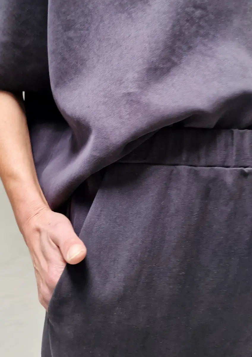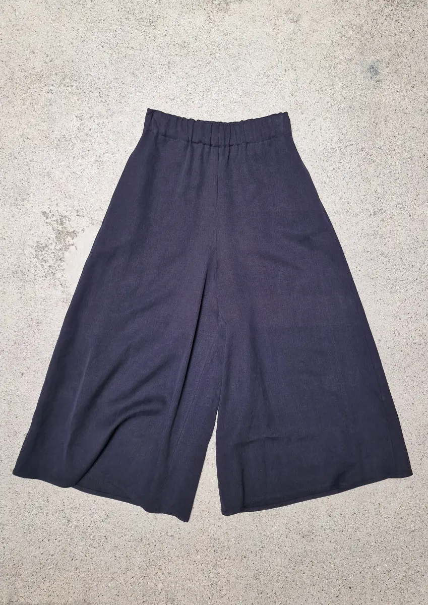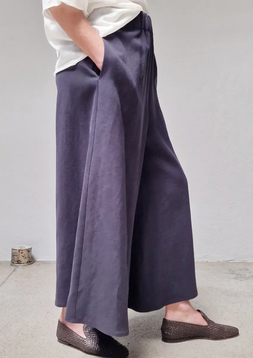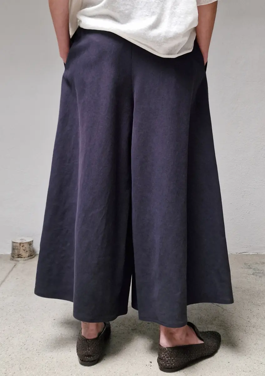 Signature pull-up-pants with elastic waistband, extra wide flared legs, two side pockets.