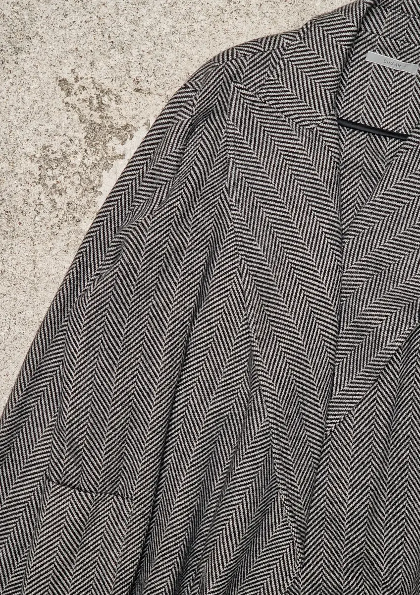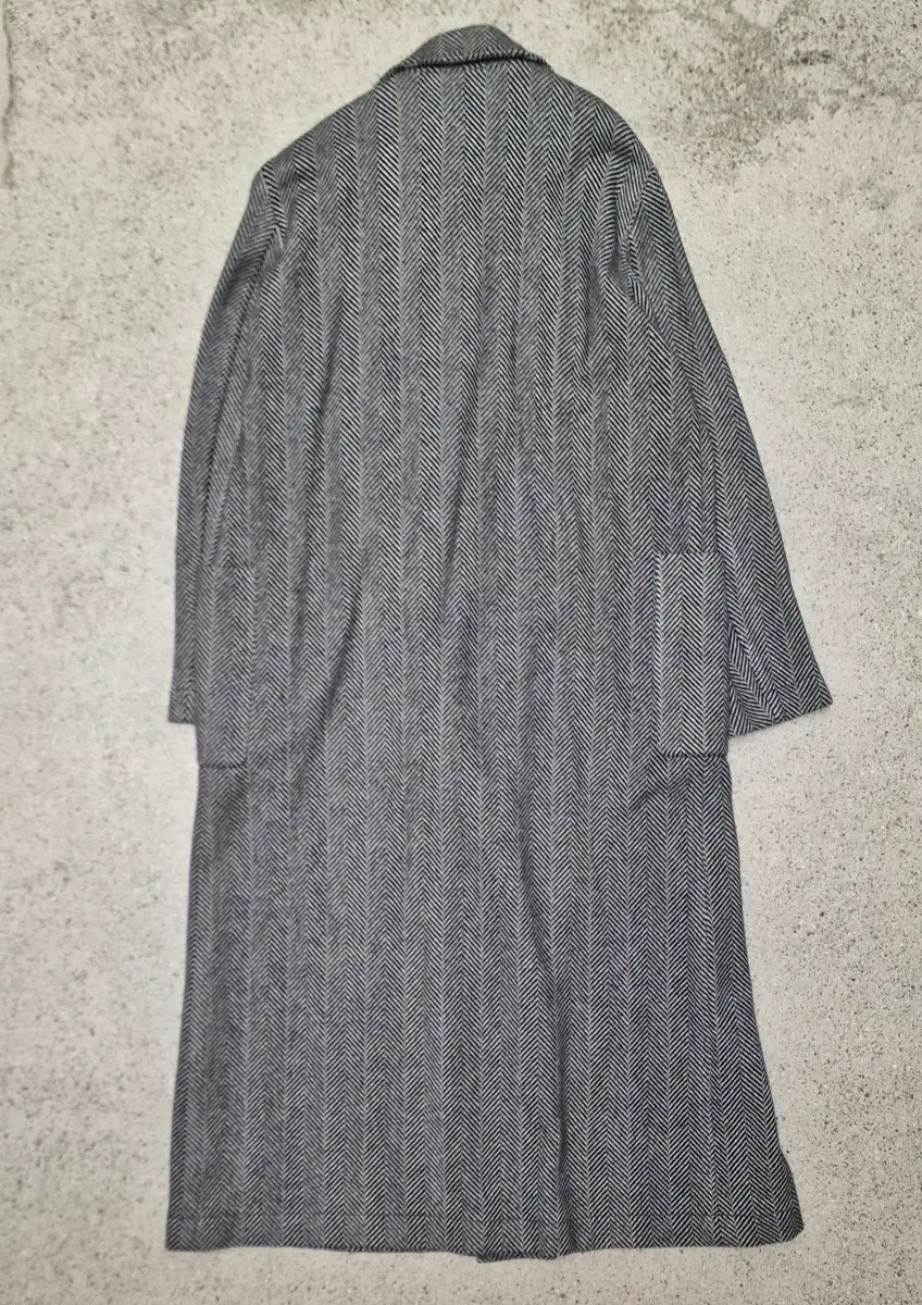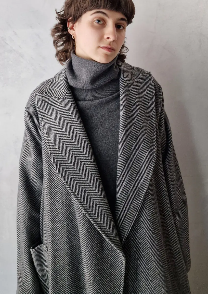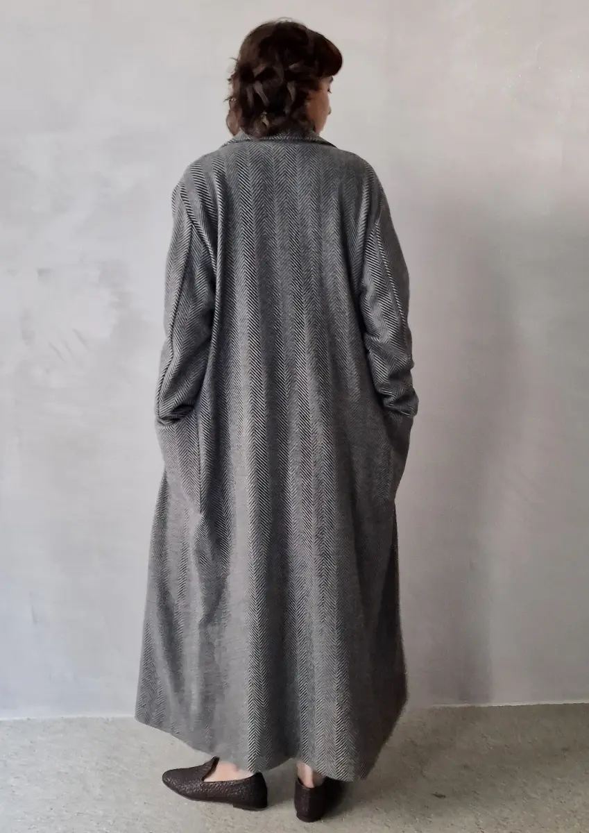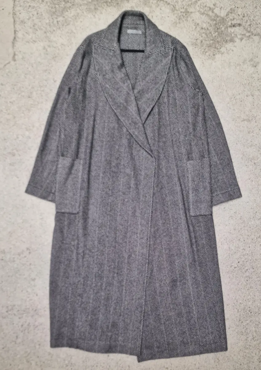 Extra long coat in double-faced herringbone cashemere cloth. Wide lapels , dropped shoulders and big patch pockets. Fits generous