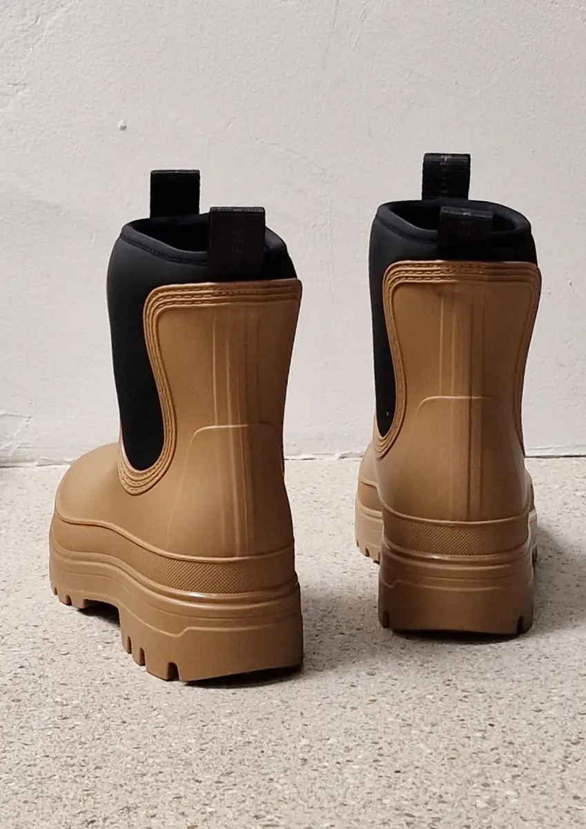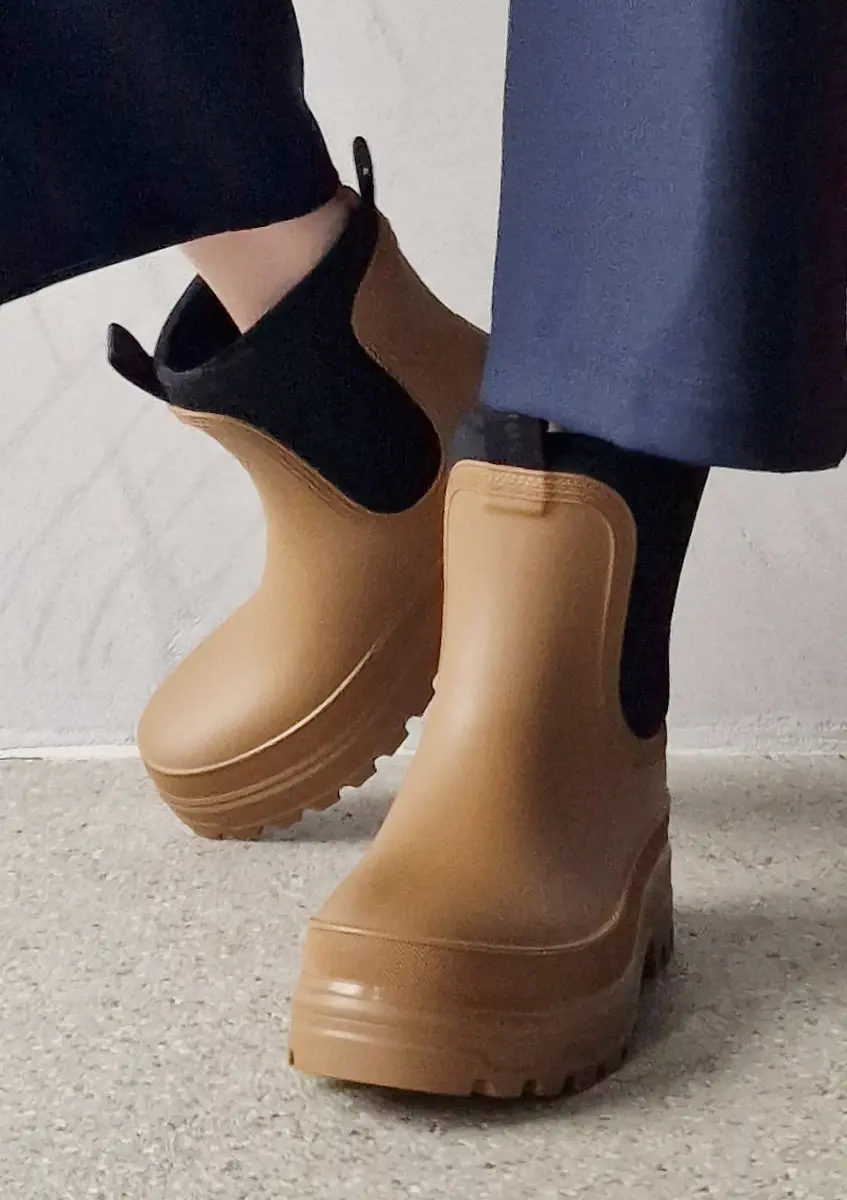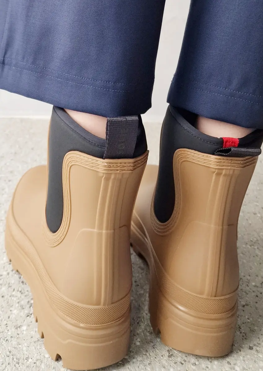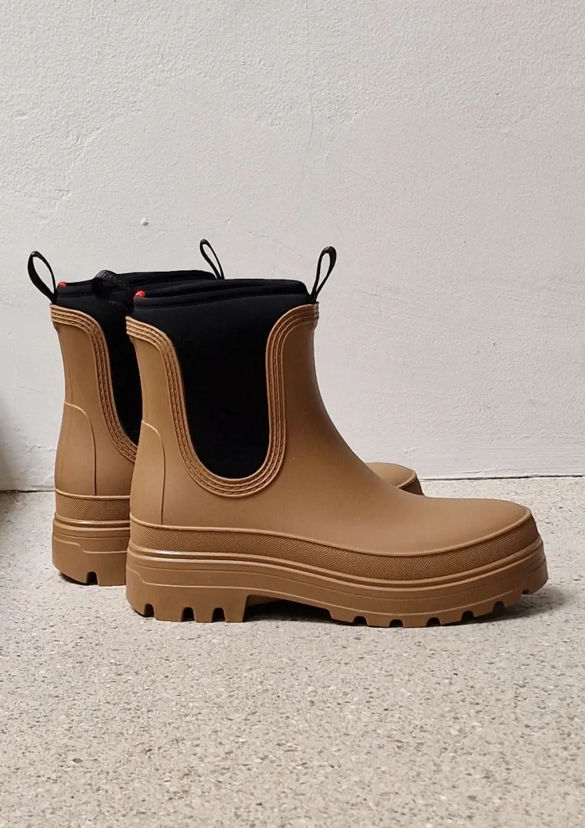 Rubber rainboots with black neoprene lining, round toe, grip sole, ribbon pull tabs front and back. True to size.