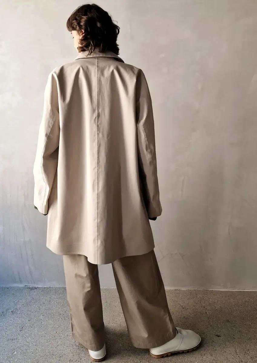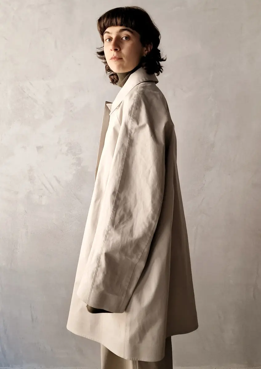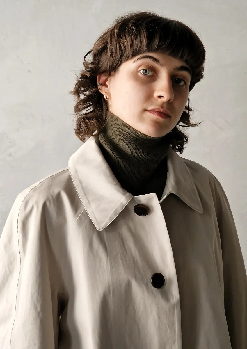 A-line coat in bonded cotton. Spread collar, concealed button closure, welt pockets. Sealed inside seams. Showerproof! Fits generous