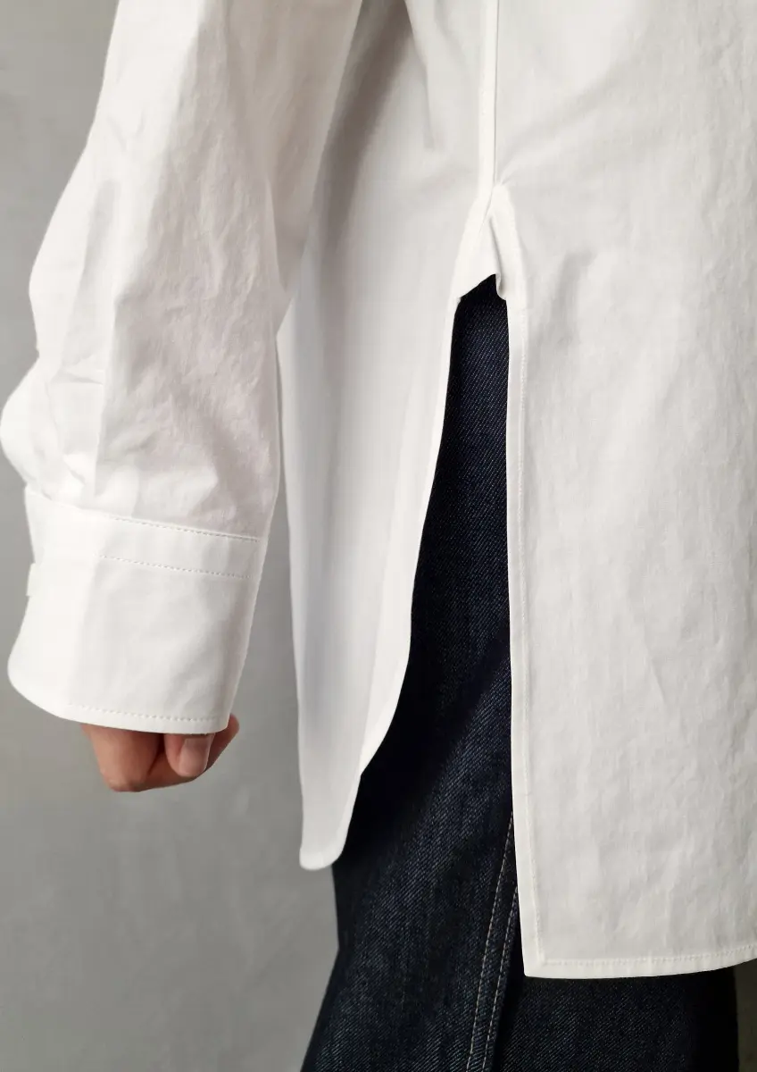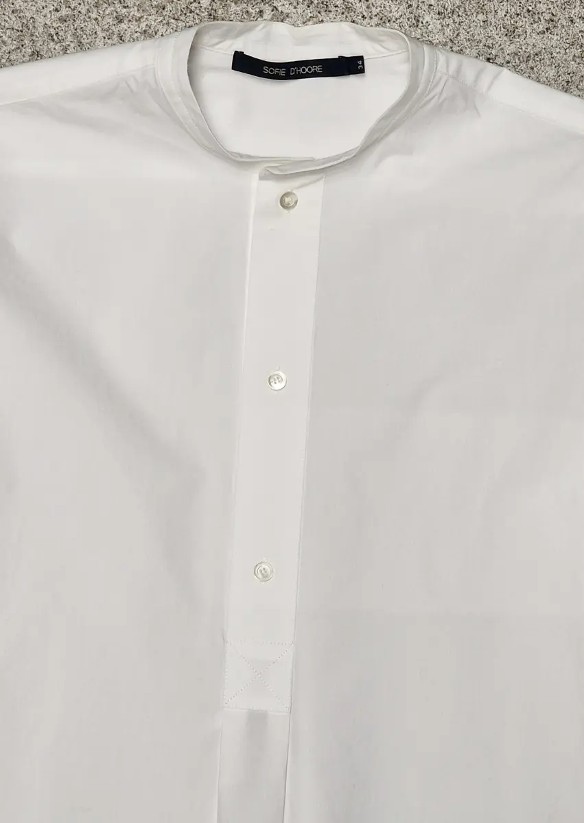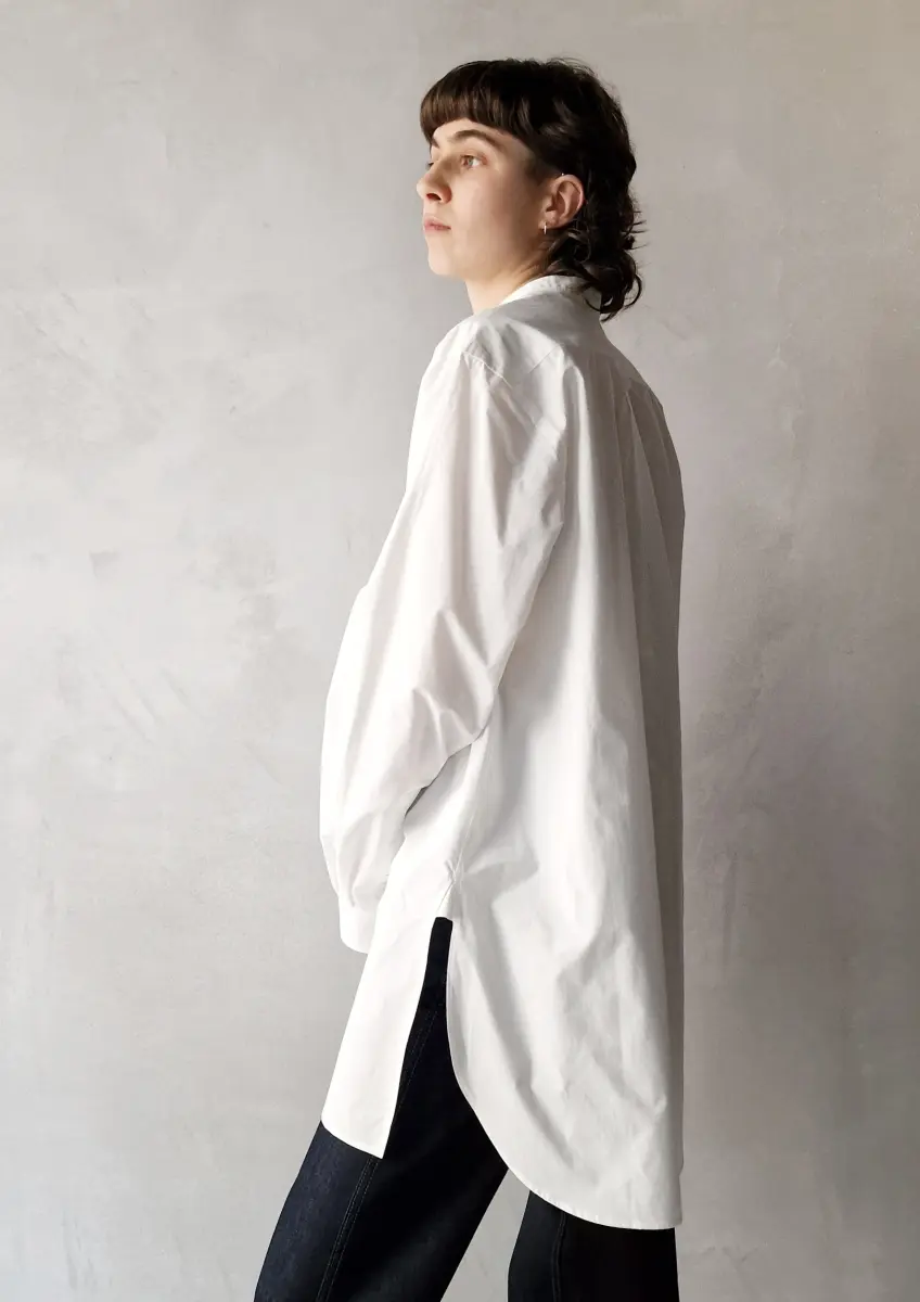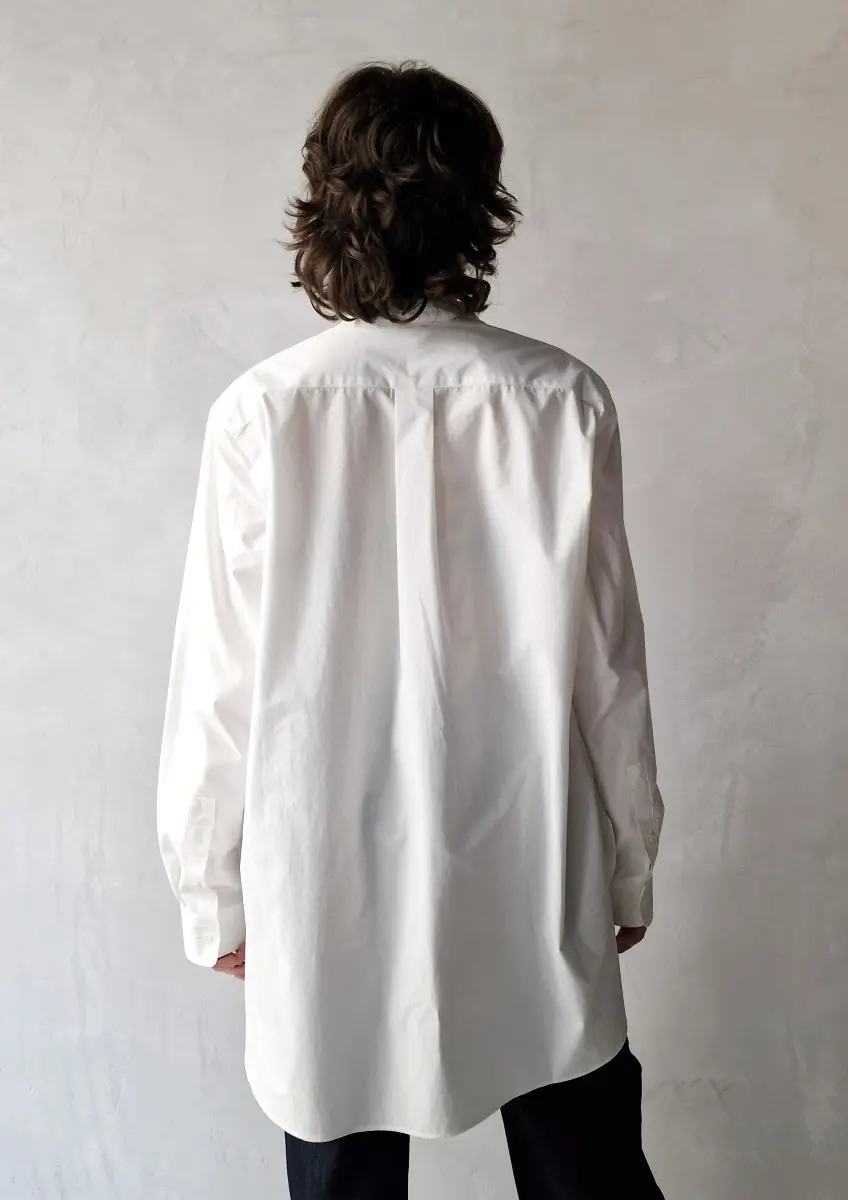 Long shirt in crisp cotton popeline, band collar, half-length button placket, set in sleeves and double button cuffs, side slits, back with a single box pleat and curved hem, white pearl buttons.