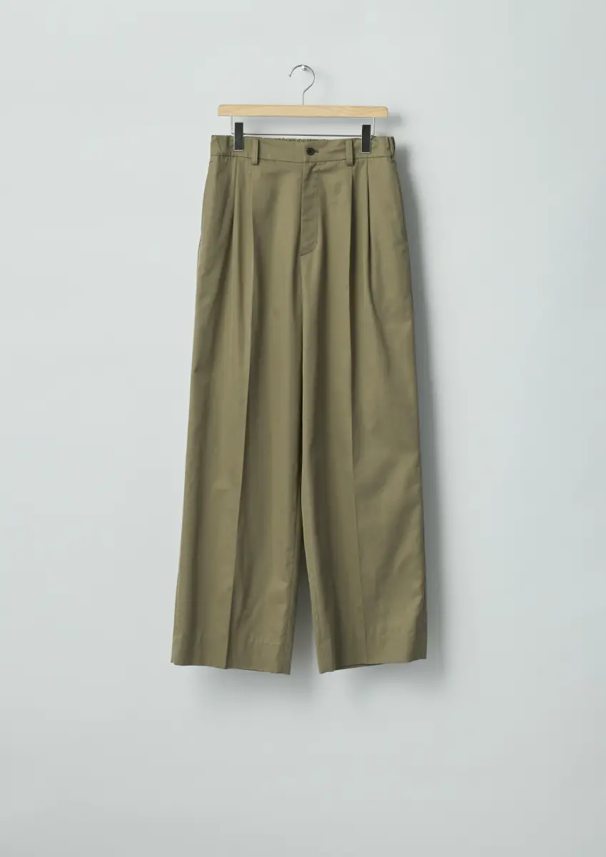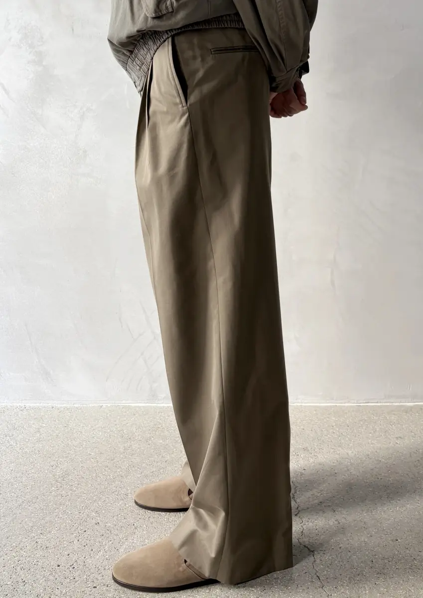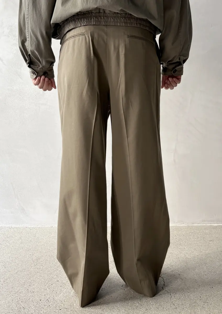 Signature wide pants with elastic waistband at the back, flat front with two pleates, comes with belt loops and additional strap inside the waistband, two side pockets, two slip pockets at the back, straight wide legs, lightweight cotton.