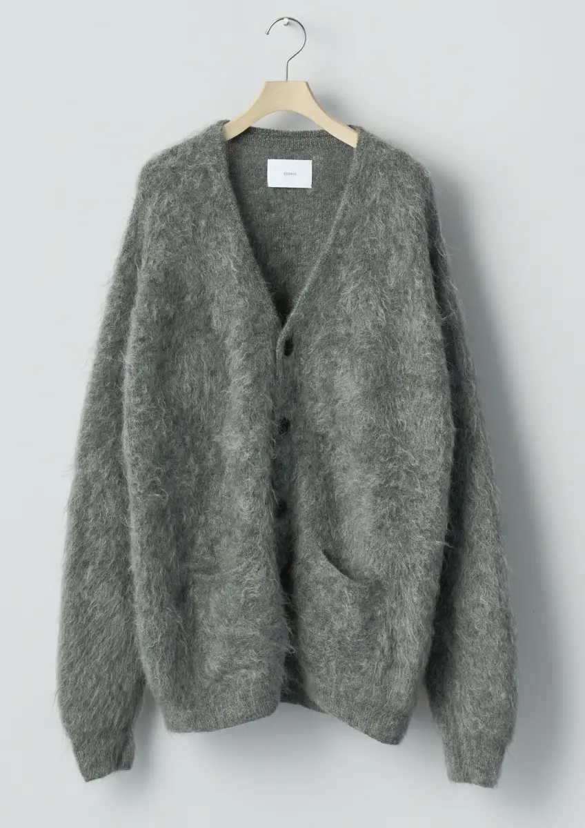 Cardigan crafted from loop yarn with South African kid mohair. While applying Nylon for core yarns as a framework, the surface is 100% mohair, allowing the natural luster and long pile of mohair to stand out, resulting exceptionally soft touch with a beautiful, radiant sheen.