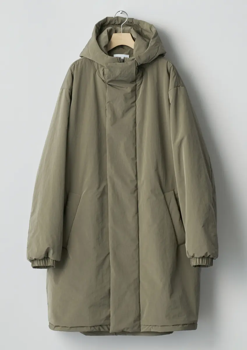Padded hooded coat, based on the PCU Level 7 Monster Parka, with refined details and adjusted proportions for an improved silhouette. The coat is filled with a deliberately light 60g padding, offering a lightweight feel suitable for extended seasonal wear. A drawcord at the hem allows for adjustable styling.