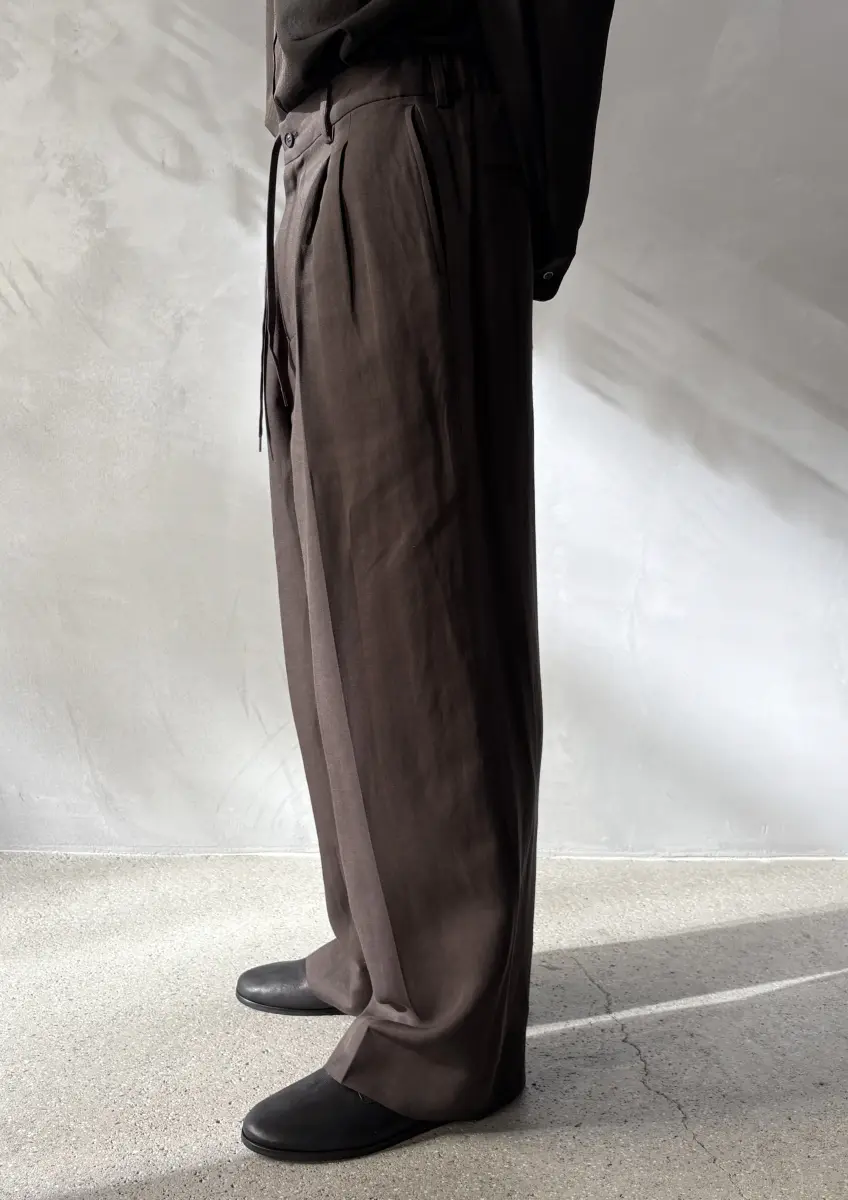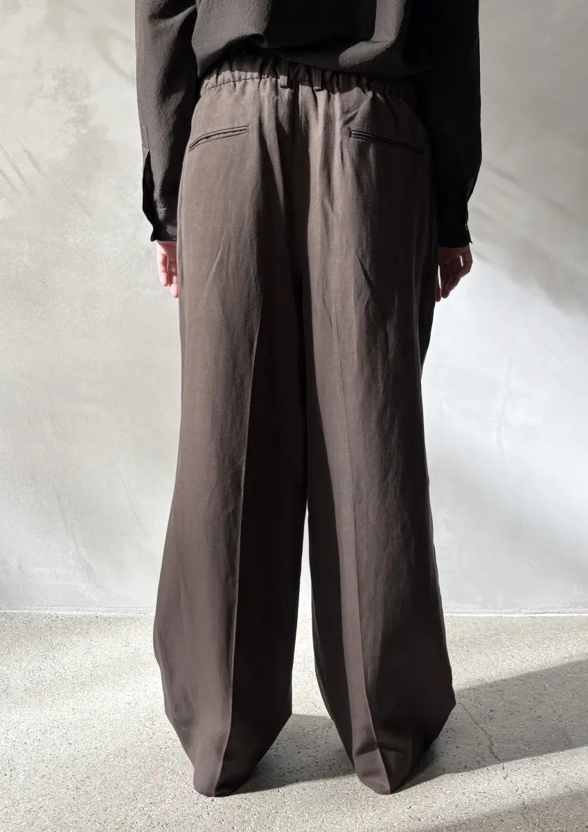 Signature wide pants with elastic waistband at the back, flat front with two pleats, comes with belt loops and additional strap inside the waistband, two side pockets, two slip pockets at the back, straight wide legs, lightweight fabric.