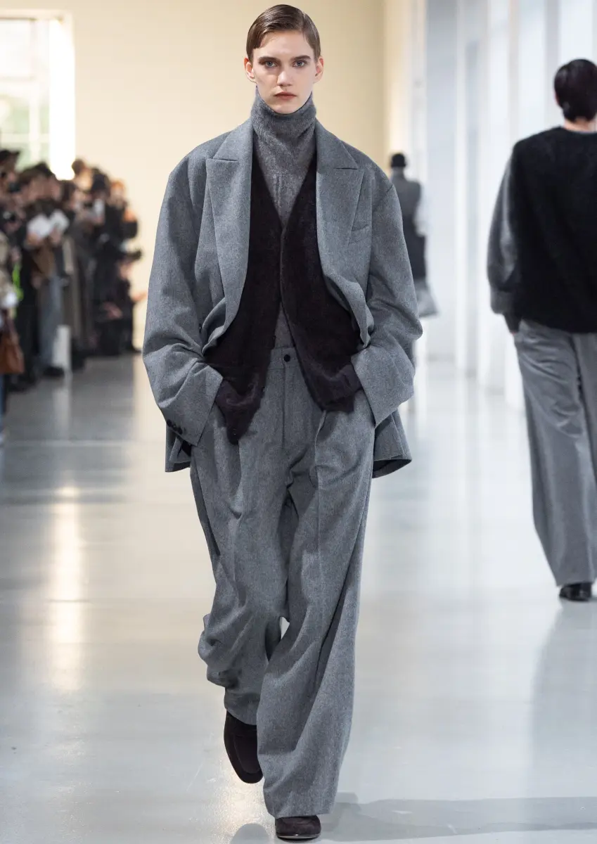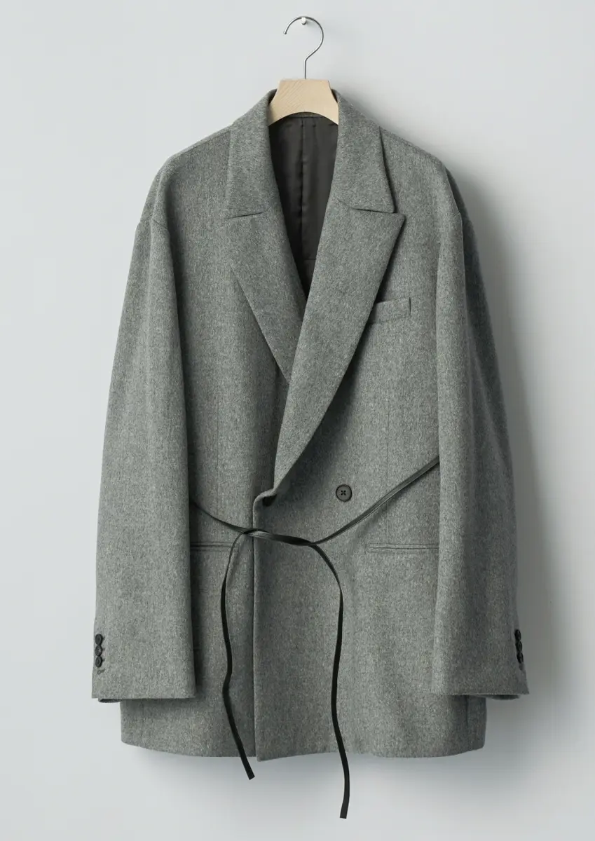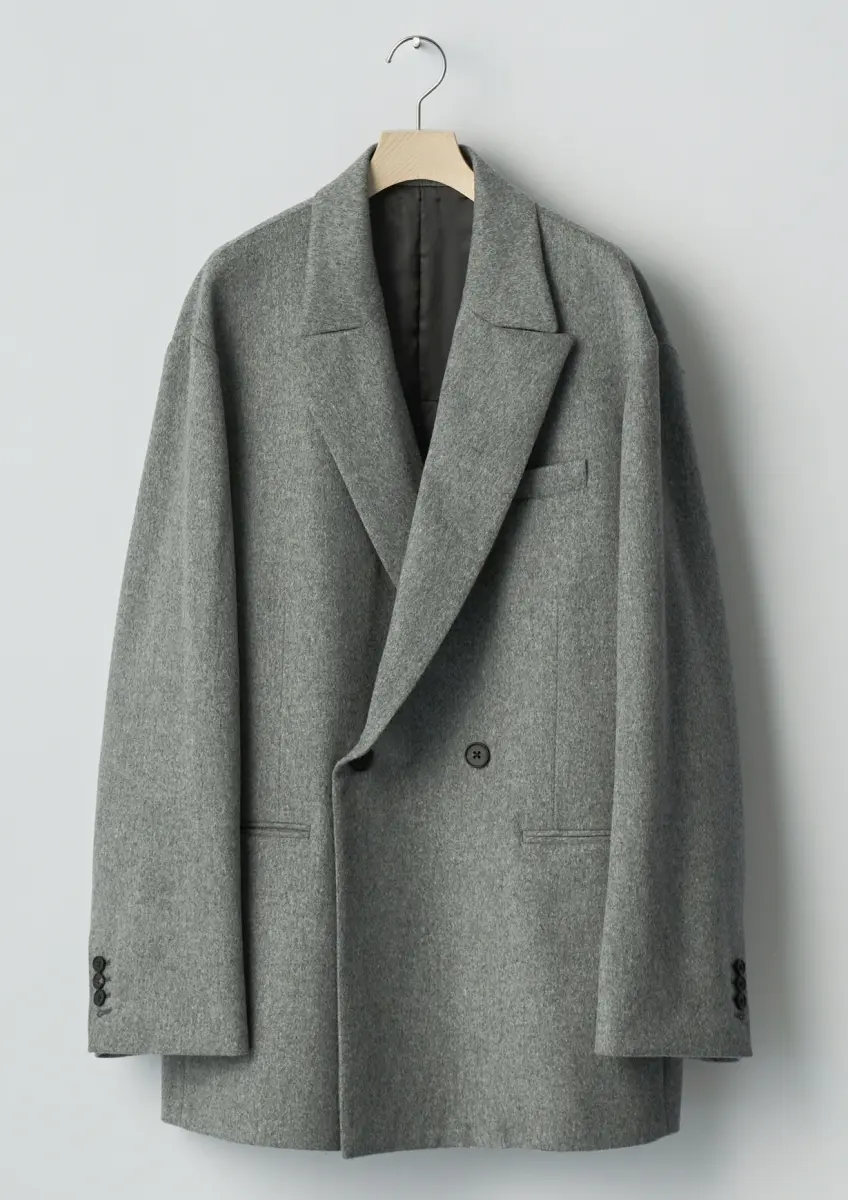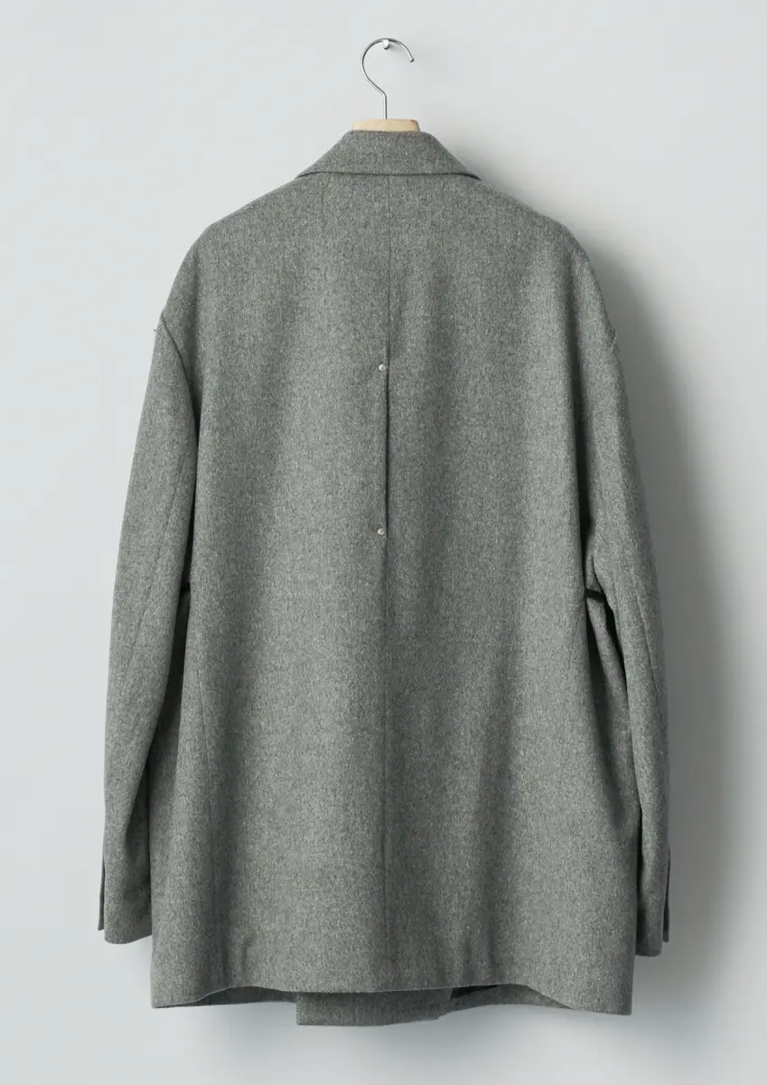 Peak lapel jacket crafted from wool cashmere beaver, featuring a soft, supple texture with gentle volume and a subtle sheen. The medium weight fabric combined premium wool and cashmere, balancing lightness with warmth. Subtle details, including a slash at the back and rivets, provide understated accents.