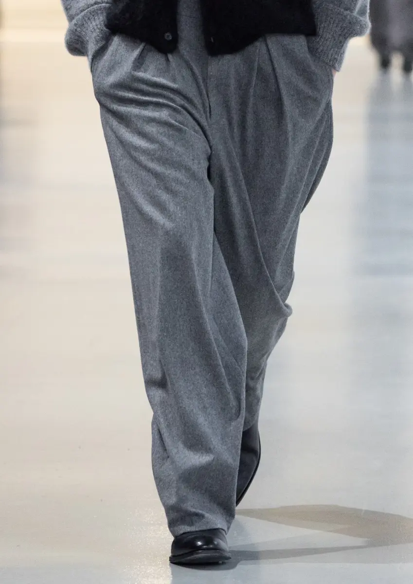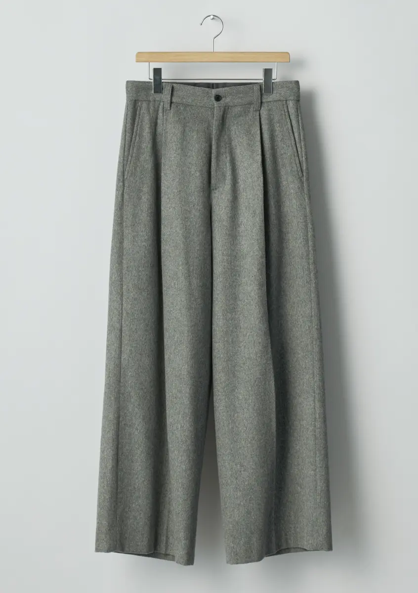 One tuck trousers with a super wide silhouette from thigh to hem, crafted from wool cashmere beaver, known for its soft, voluminous texture and subtle sheen. The waist is tailored for a clean fit, creating an elegant balance despite the wide silhouette.