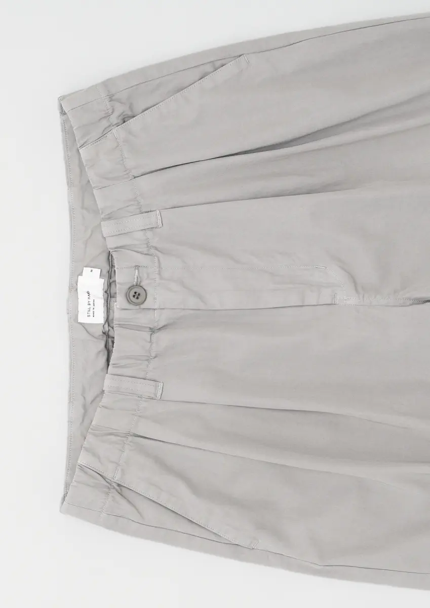 Double pleated pants, with elastic waistband and additional belt loops, wide and tapered legs, two side pockets, two slip pockets at the back, garment-dyed cotton fabric. Matches the 3B jacket.