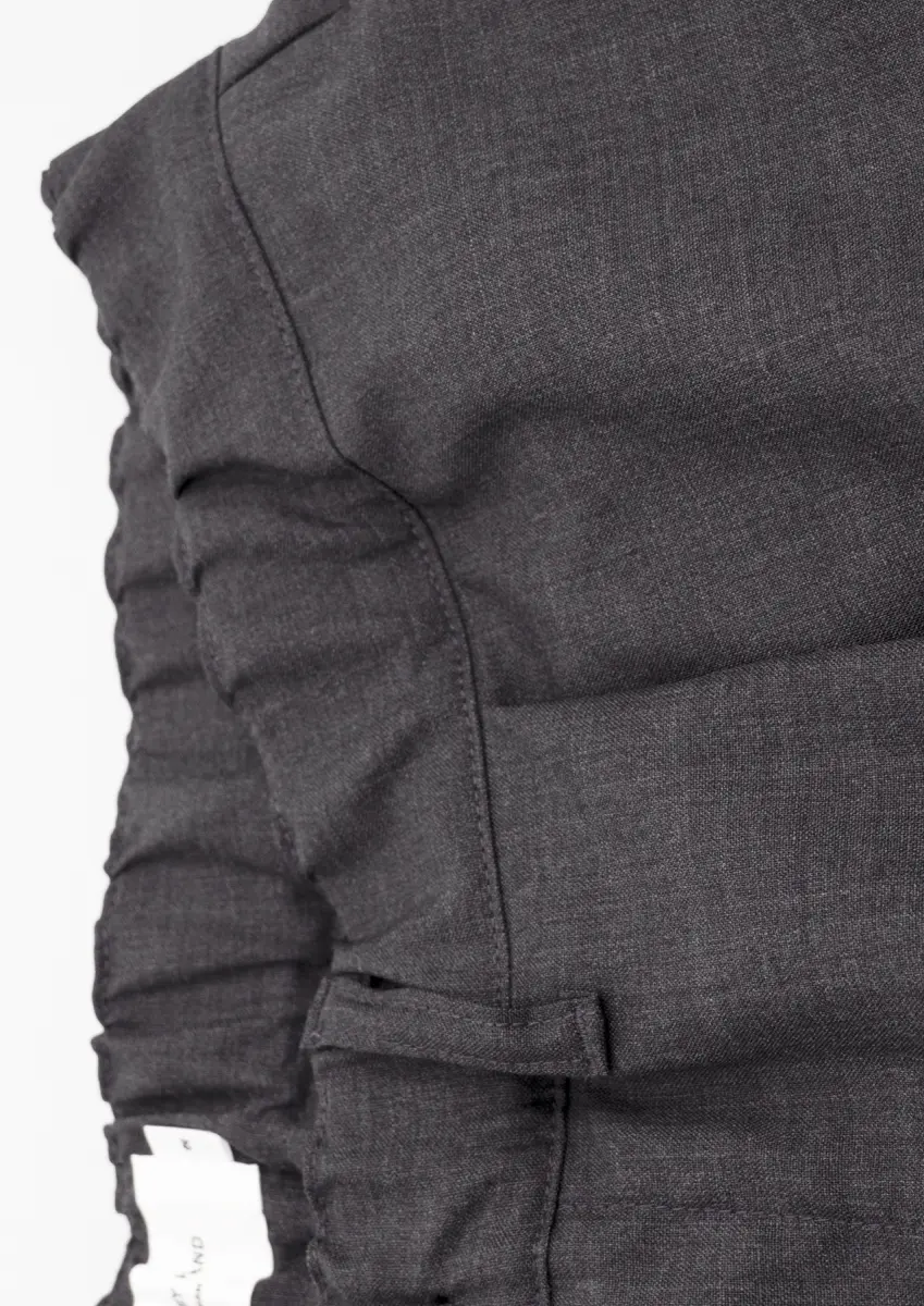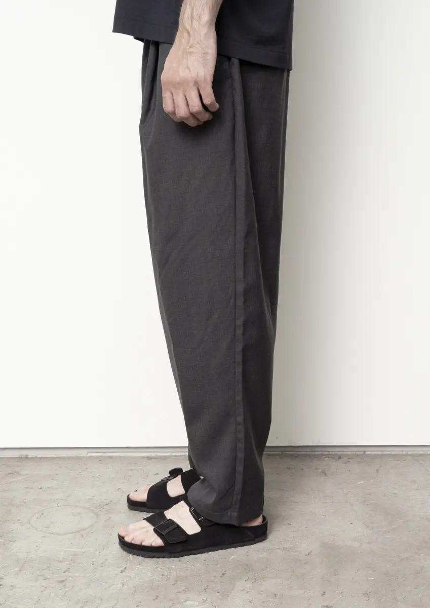 Pleated pants, with elastic waistband and additional belt loops, wide and tapered legs, two side pockets, one flap pocket and one piped pocket at the back. Lightweight cool wool fabric.