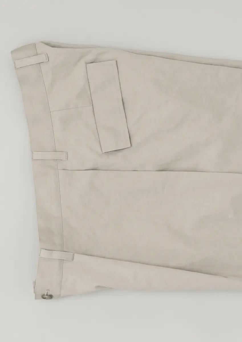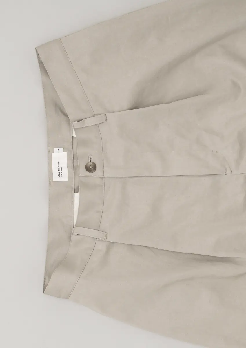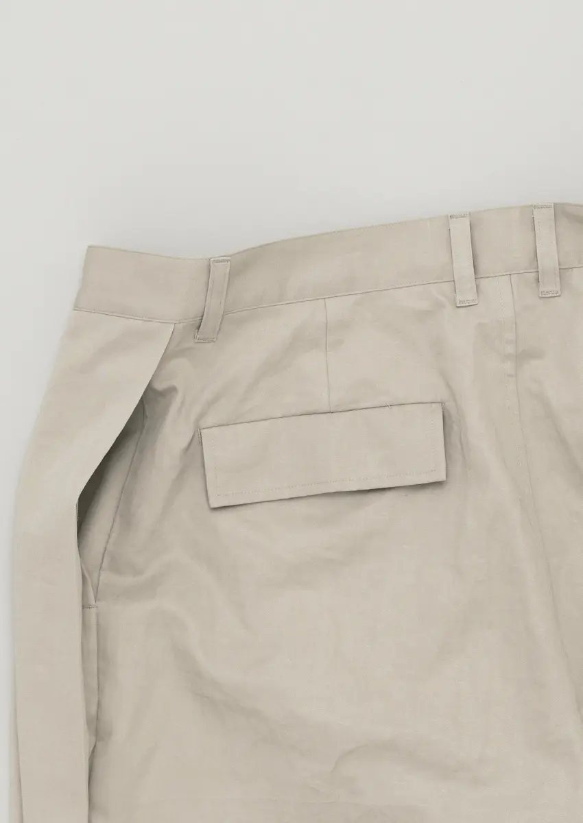 Classic pleated oversize bermudas, two side pockets, one flap pocket and one piped pocket at the back. Structured quality, solid fabric.